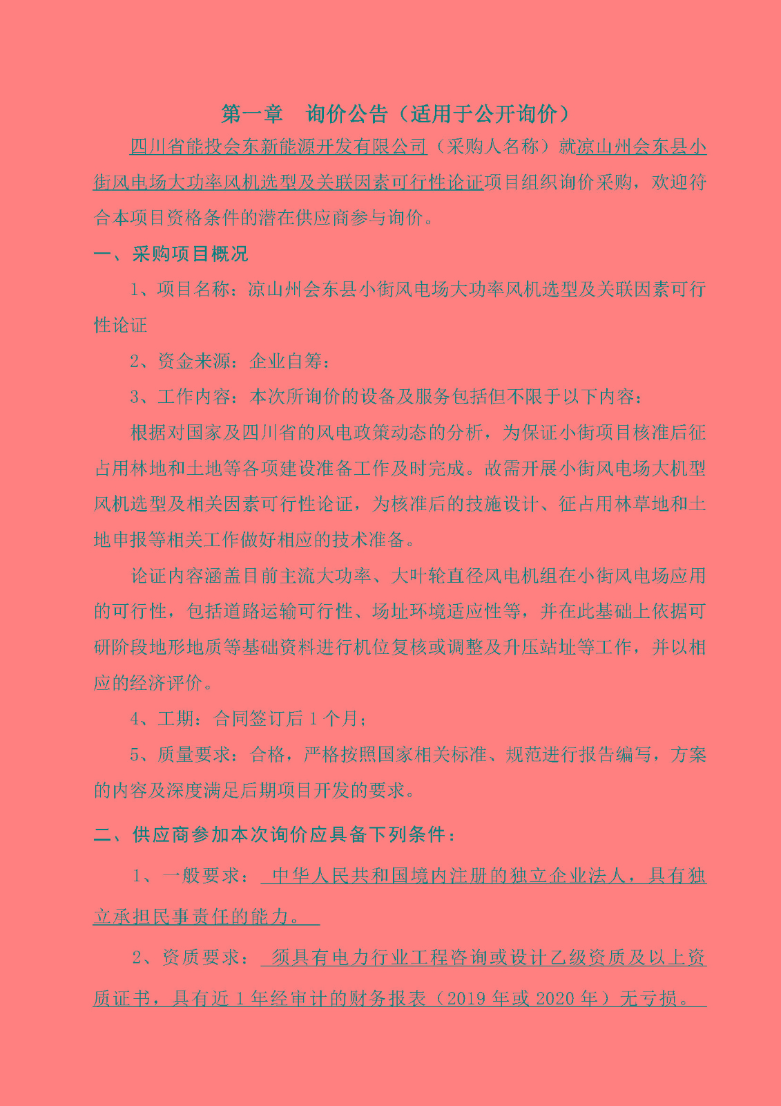 四川省能投会东新能源开发有限公司(采购人名称)就凉山州会东县小街风电场大功率风机选型及关联因素可行性论证项目组织询价采购,欢迎符合本项目资格条件的潜在供应商参与询价。