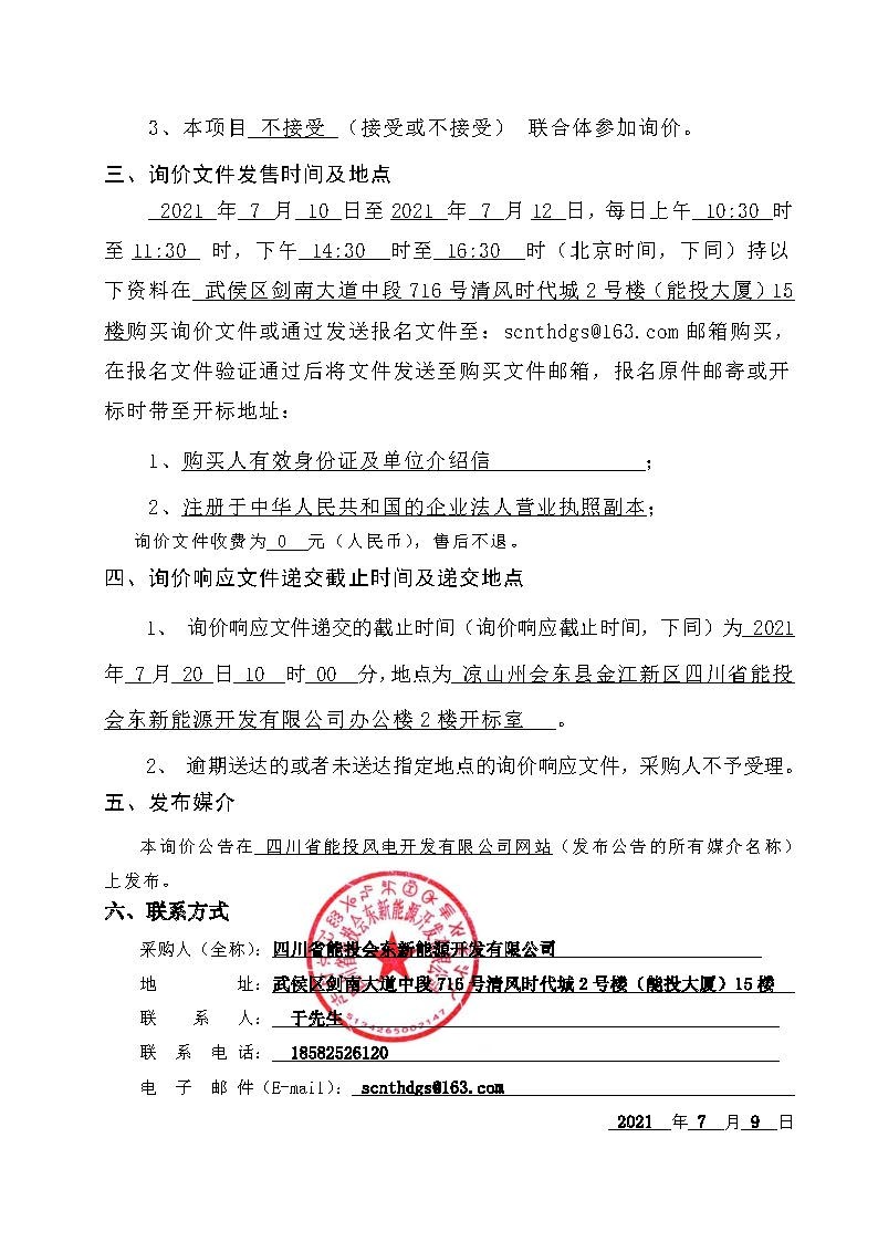 1、 询价响应文件递交的截止时间(询价响应截止时间,下同)为 2021 年 7月 20 日 10 时 00 分,地点为 凉山州会东县金江新区四川省能投会东新能源开发有限公司办公楼2楼开标室 。