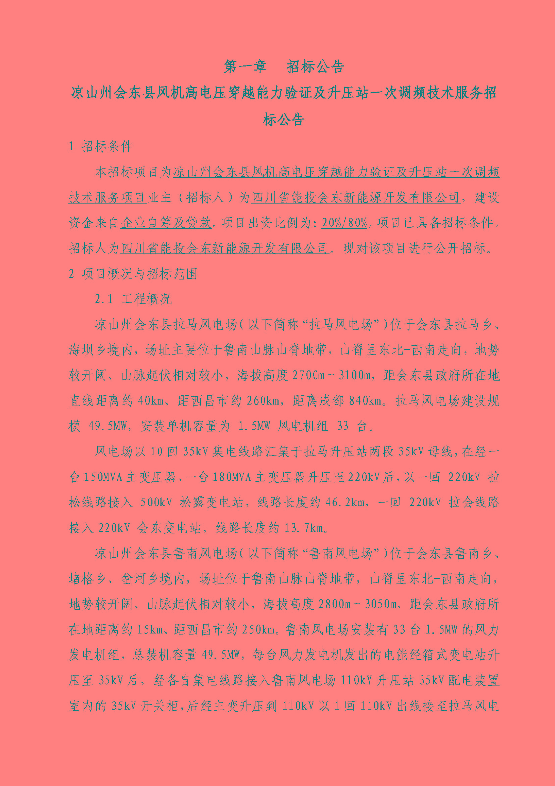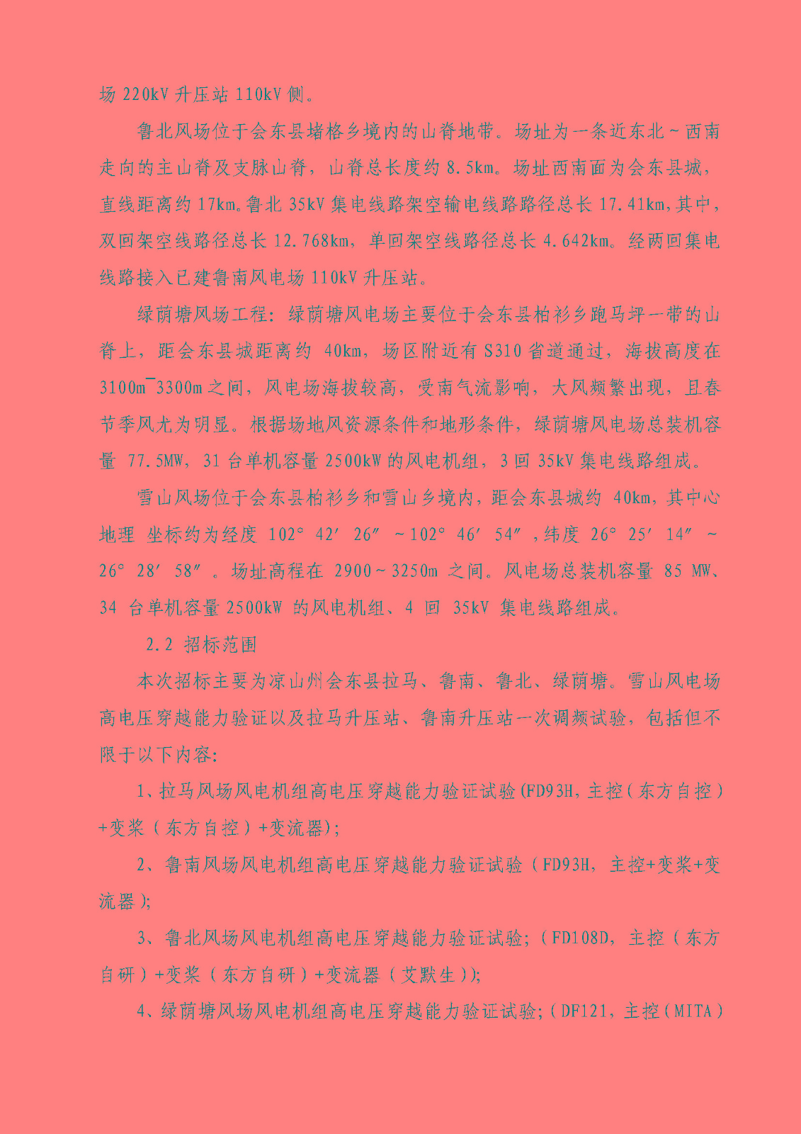 本次招标主要为凉山州会东县拉马、鲁南、鲁北、绿荫塘。雪山风电场高电压穿越能力验证以及拉马升压站、鲁南升压站一次调频试验,包括但不限于以下内容: