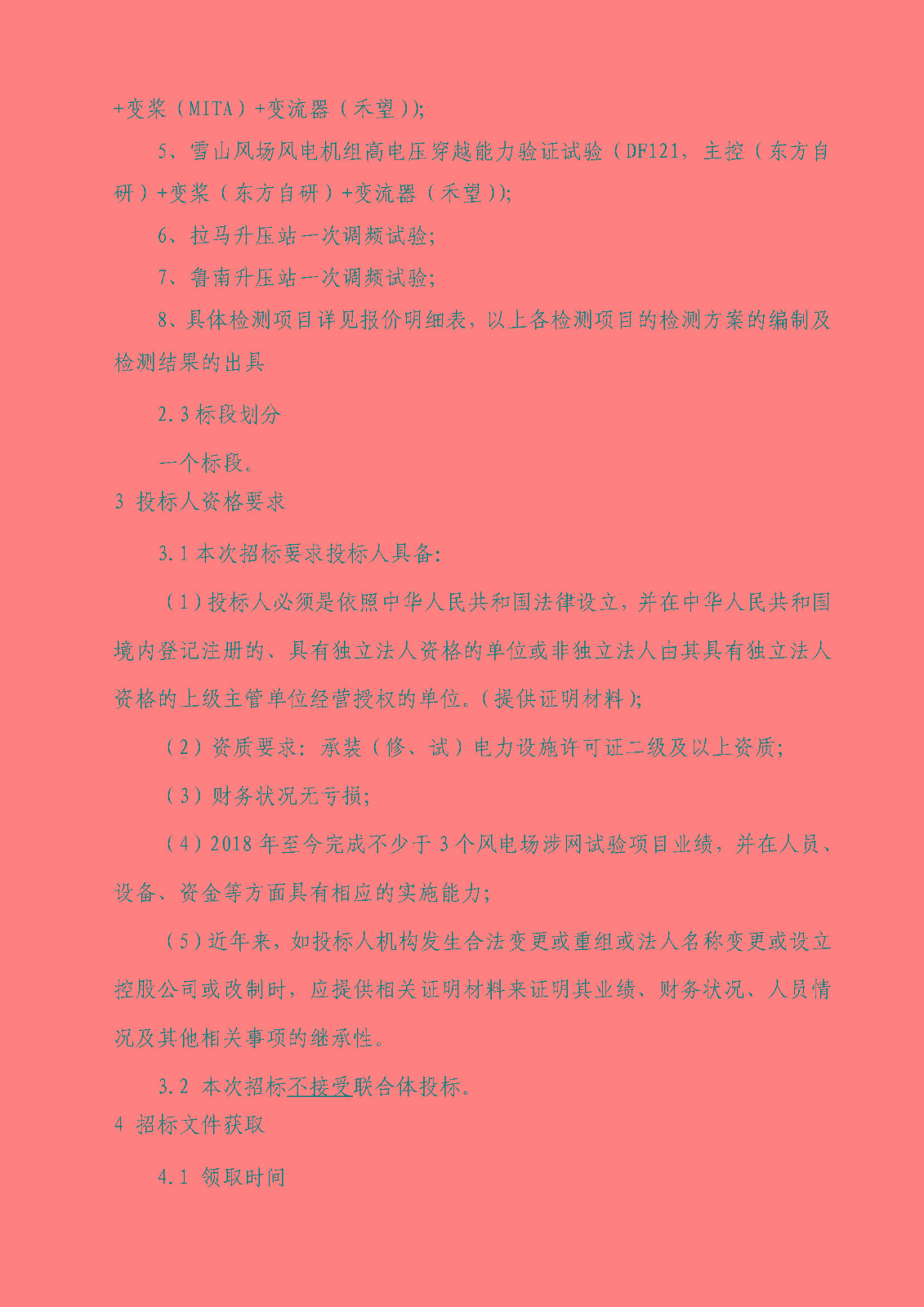 (4)2018年至今完成不少于3个风电场涉网试验项目业绩,并在人员、设备、资金等方面具有相应的实施能力;