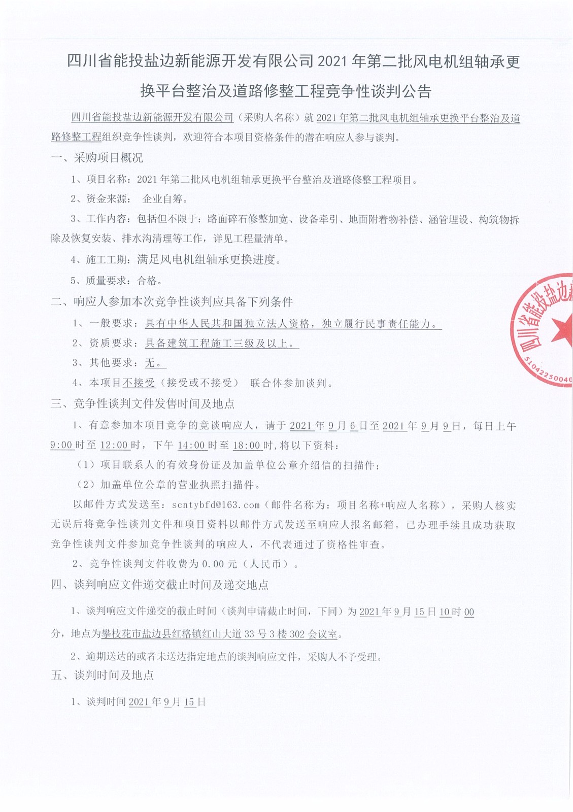 四川省能投盐边新能源开发有限公司(采购人名称)就2021年第二批风电机组轴承更换平台整治及道路修整工程组织竞争性谈判,欢迎符合本项目资格条件的潜在响应人参与谈判。