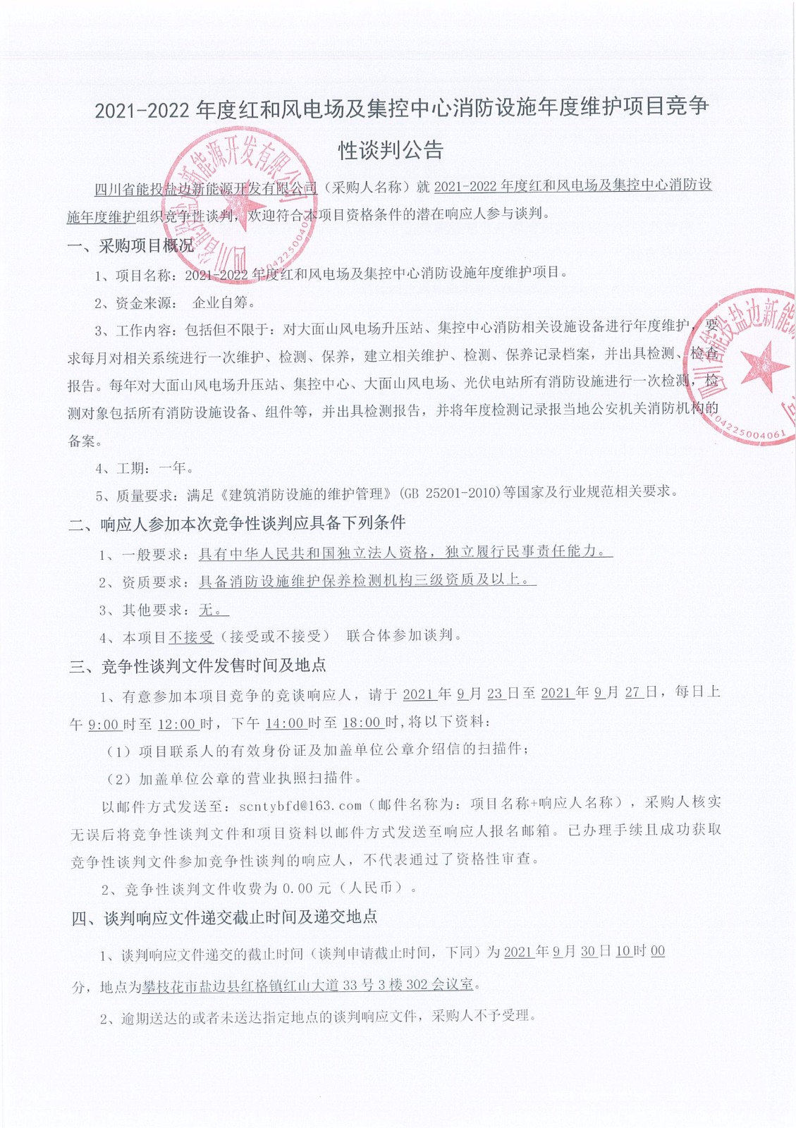 四川省能投盐边新能源开发有限公司(采购人名称)就2021-2022年度红和风电场及集控中心消防设施年度维护组织竞争性谈判,欢迎符合本项目资格条件的潜在响应人参与谈判。