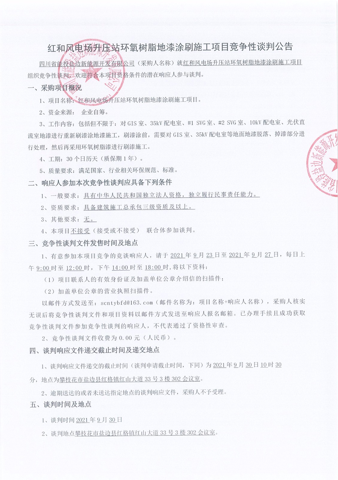 四川省能投盐边新能源开发有限公司(采购人名称)就红和风电场升压站环氧树脂地漆涂刷施工项目组织竞争性谈判,欢迎符合本项目资格条件的潜在响应人参与谈判。