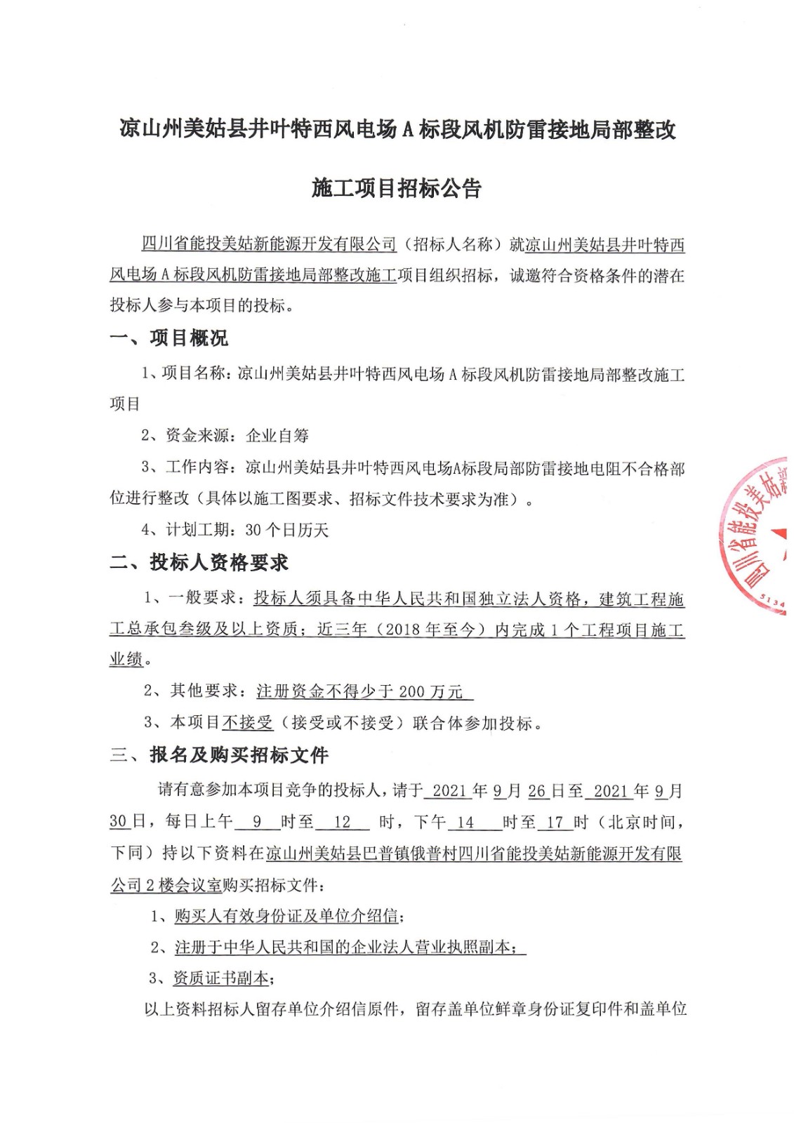 四川省能投美姑新能源开发有限公司(招标人名称)就凉山州美姑县井叶特西风电场A标段风机防雷接地局部整改施工项目组织招标,诚邀符合资格条件的潜在投标人参与本项目的投标。