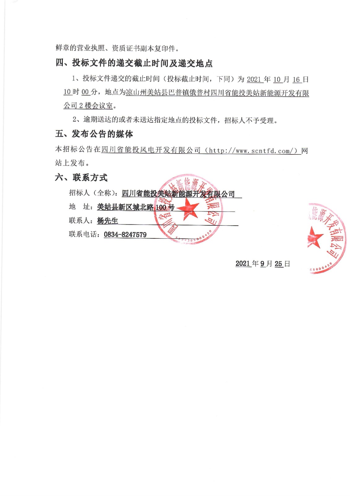 1、投标文件递交的截止时间(投标截止时间,下同)为2021年10月16日10时00分,地点为凉山州美姑县巴普镇俄普村四川省能投美姑新能源开发有限公司2楼会议室。