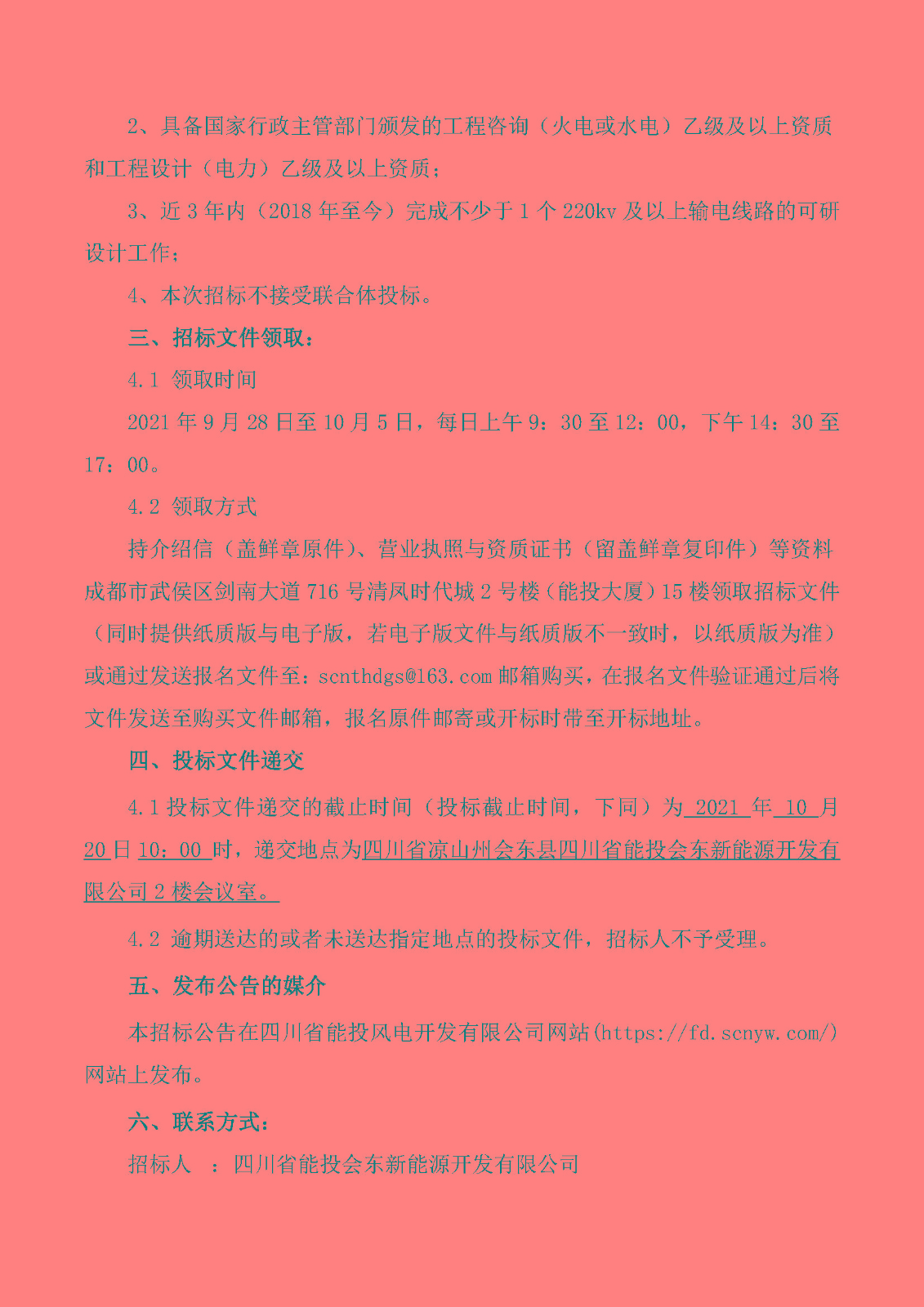 4.1投标文件递交的截止时间(投标截止时间,下同)为 2021 年 10 月 20日10:00 时,递交地点为四川省凉山州会东县四川省能投会东新能源开发有限公司2楼会议室。