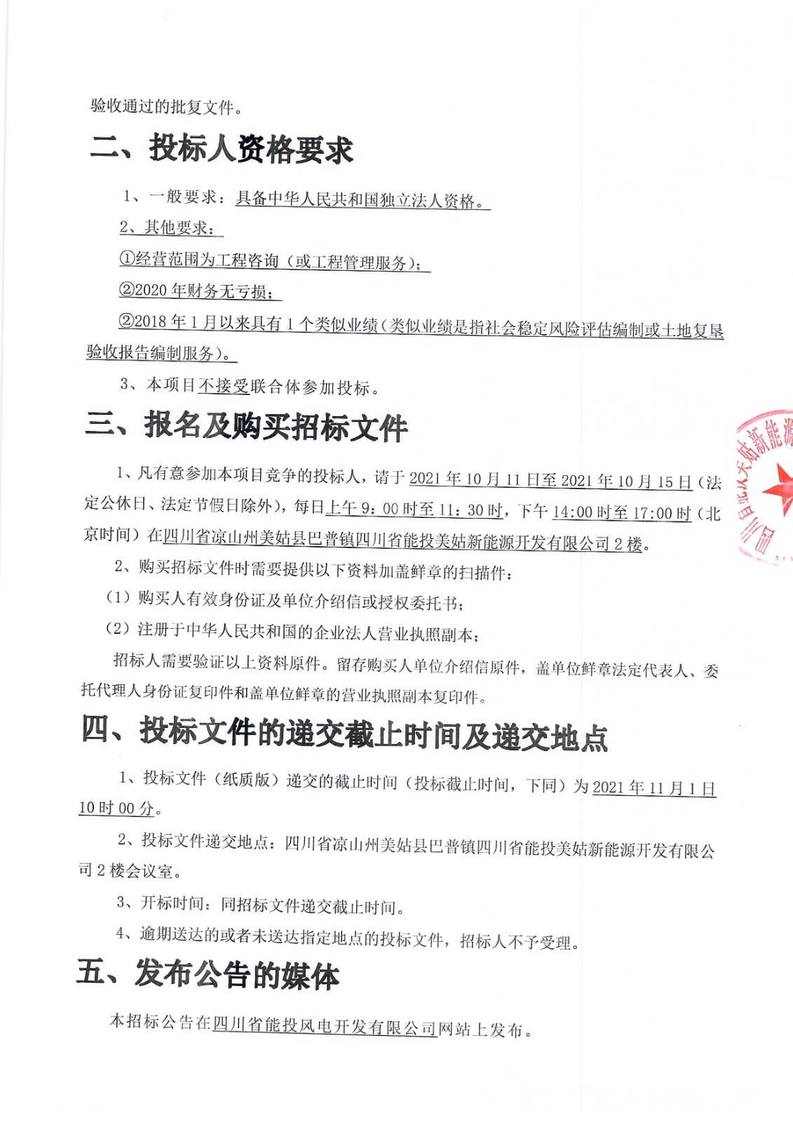 1、凡有意参加本项目竞争的投标人,请于2021年10月11日至2021年10月15日(法定公休日、法定节假日除外),每日上午9:00时至11:30时,下午14:00时至17:00时(北京时间)在四川省凉山州美姑县巴普镇四川省能投美姑新能源开发有限公司2楼。