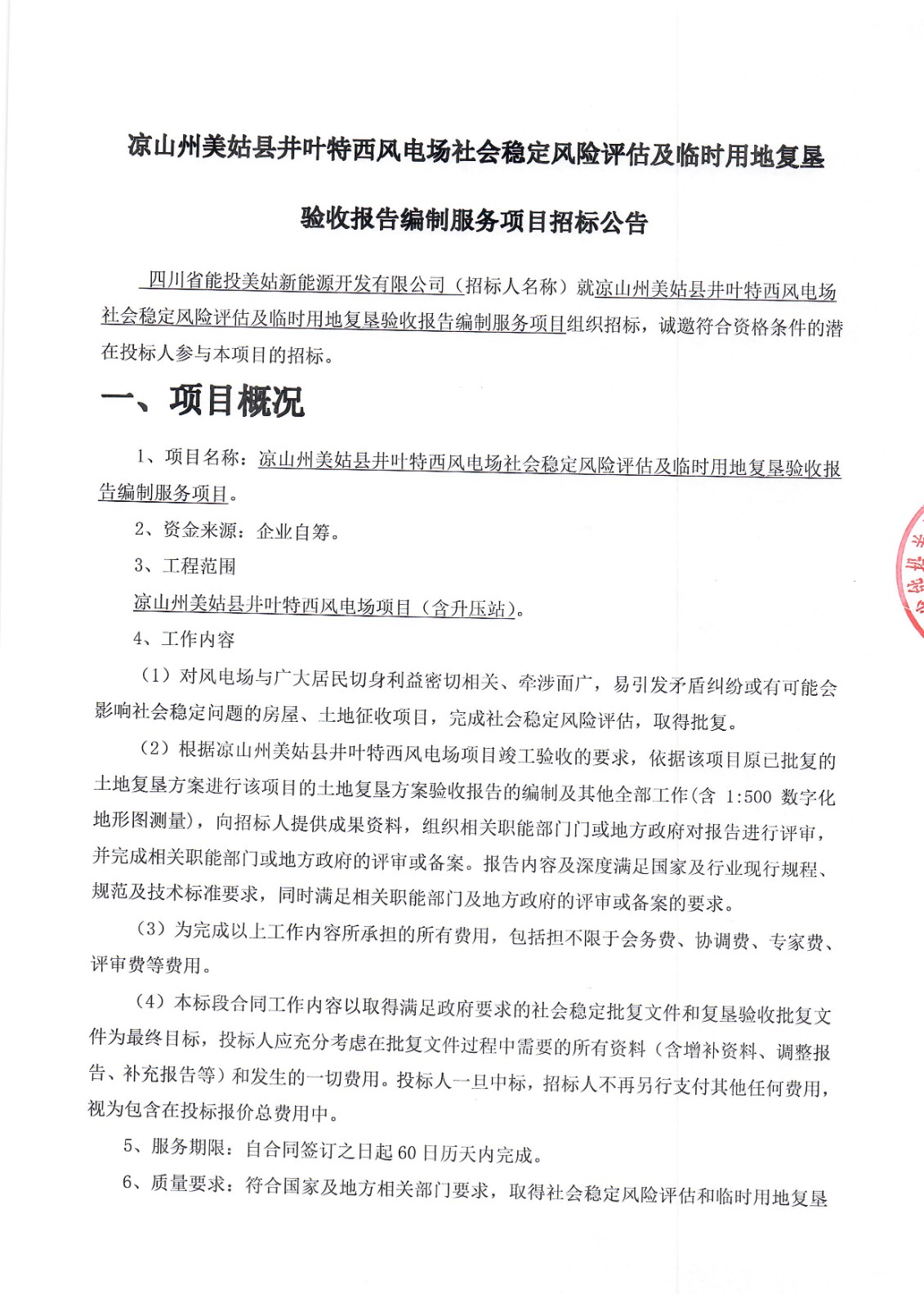 1、项目名称:凉山州美姑县井叶特西风电场社会稳定风险评估及临时用地复垦验收报告编制服务项目。