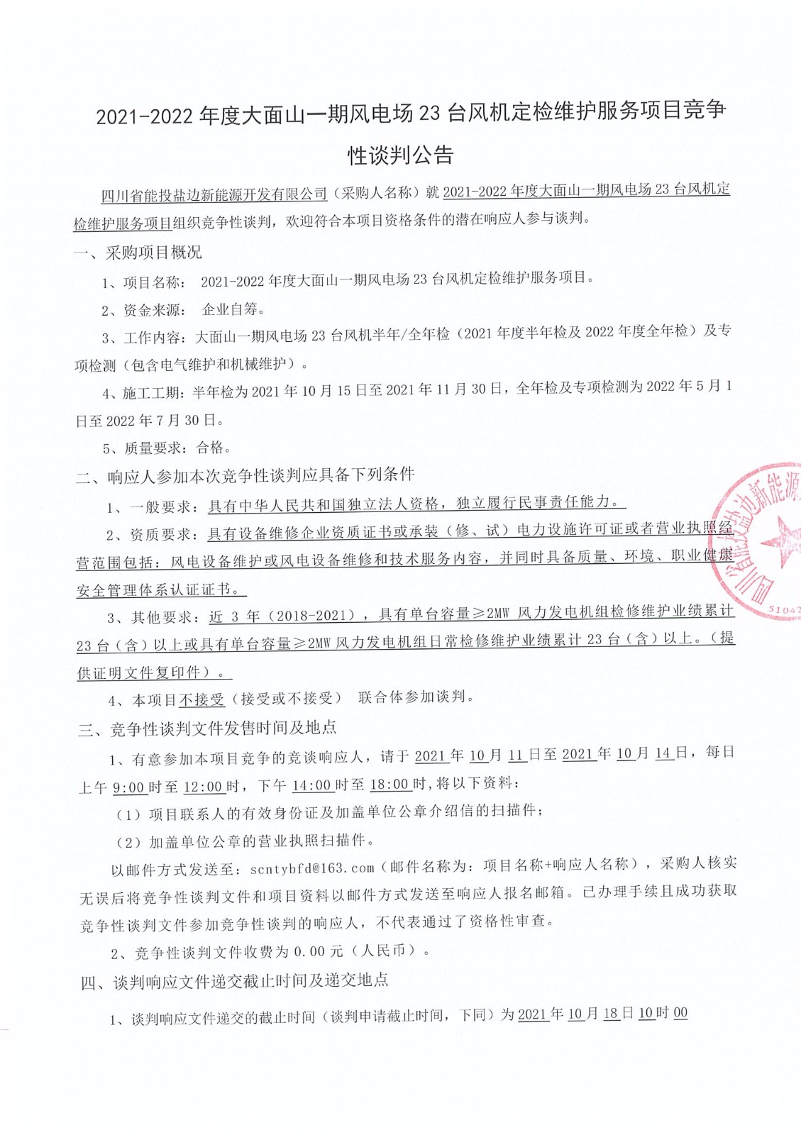 四川省能投盐边新能源开发有限公司(采购人名称)就2021-2022年度大面山一期风电场23台风机定检维护服务项目组织竞争性谈判,欢迎符合本项目资格条件的潜在响应人参与谈判。