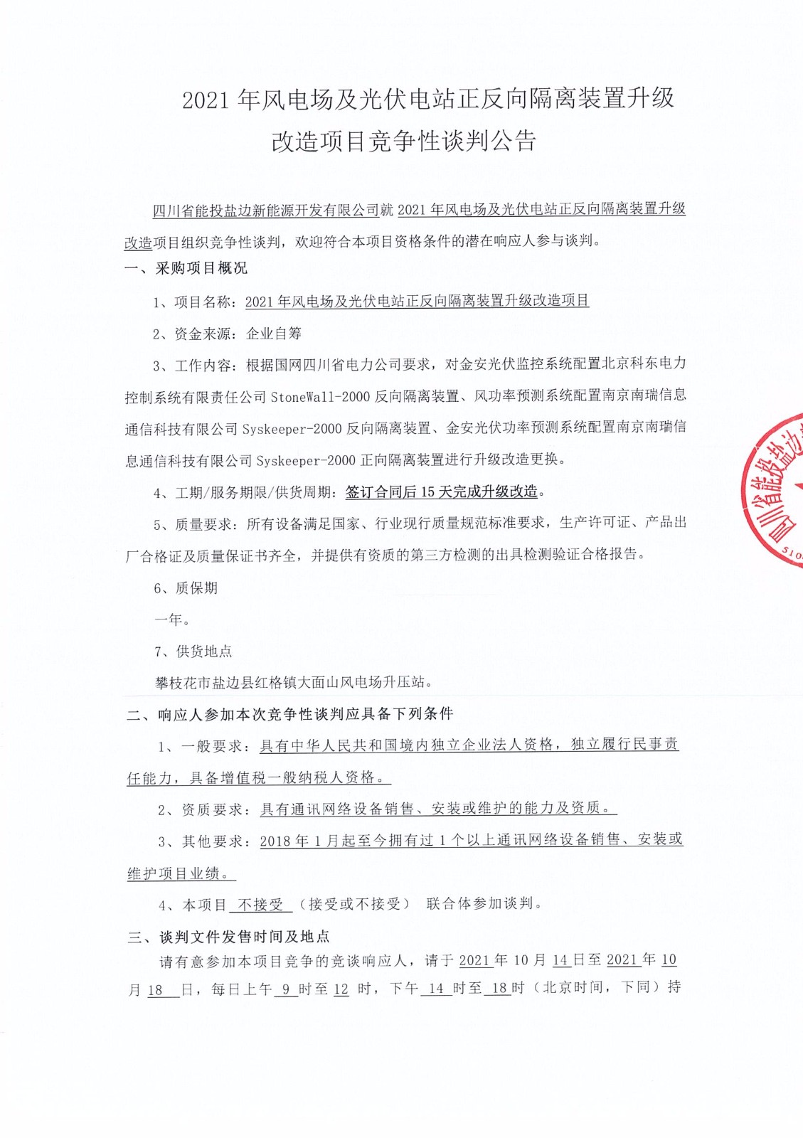 四川省能投盐边新能源开发有限公司就2021年风电场及光伏电站正反向隔离装置升级改造项目组织竞争性谈判,欢迎符合本项目资格条件的潜在响应人参与谈判。