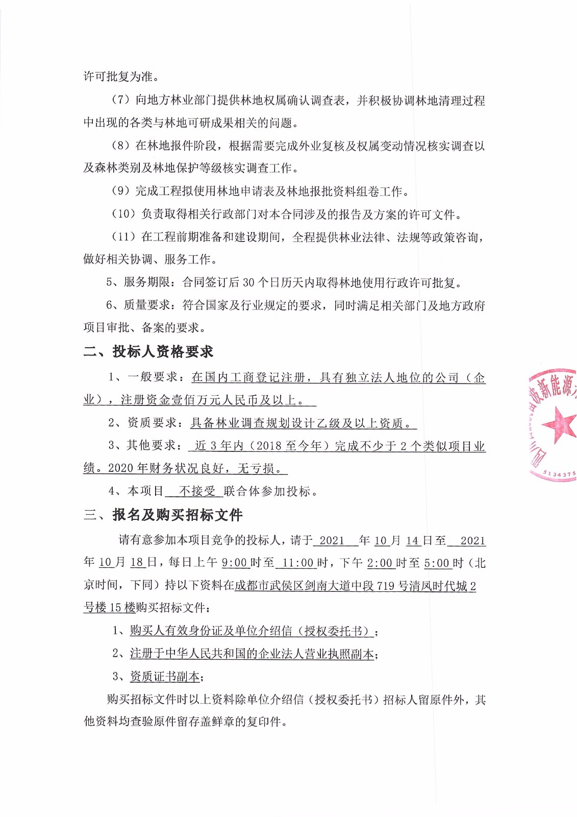请有意参加本项目竞争的投标人,请于 2021 年10月14日至 2021 年10月18日,每日上午9:00时至 11:00时,下午2:00时至5:00时(北京时间,下同)持以下资料在成都市武侯区剑南大道中段719号清凤时代城2号楼15楼购买招标文件: