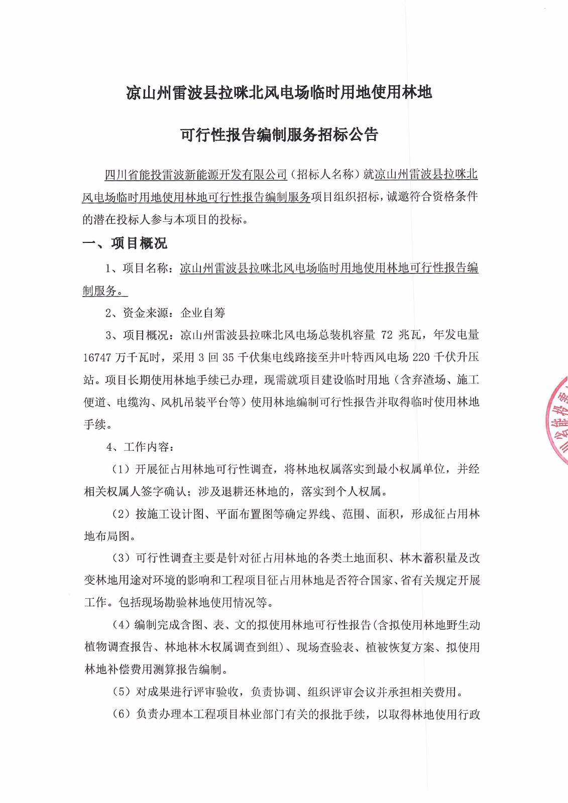 四川省能投雷波新能源开发有限公司(招标人名称)就凉山州雷波县拉咪北风电场临时用地使用林地可行性报告编制服务项目组织招标,诚邀符合资格条件的潜在投标人参与本项目的投标。