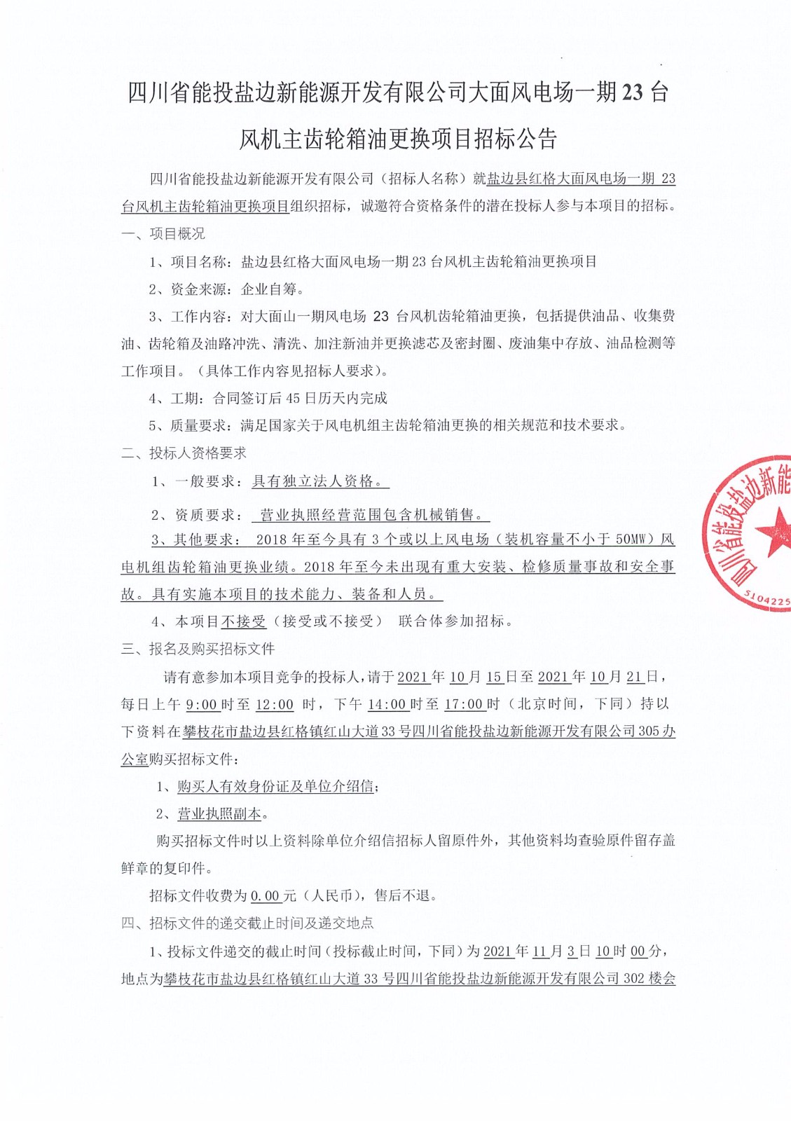 四川省能投盐边新能源开发有限公司(招标人名称)就盐边县红格大面风电场一期23台风机主齿轮箱油更换项目组织招标,诚邀符合资格条件的潜在投标人参与本项目的招标。