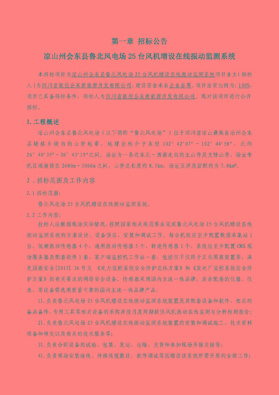本招标项目为凉山州会东县鲁北风电场25台风机增设在线振动监测系统项目业主(招标人)为四川省能投会东新能源开发有限公司,建设资金来自企业自筹。项目出资比例为:100%,项目已具备招标条件,招标人为四川省能投会东新能源开发有限公司。现对该项目进行公开招标。