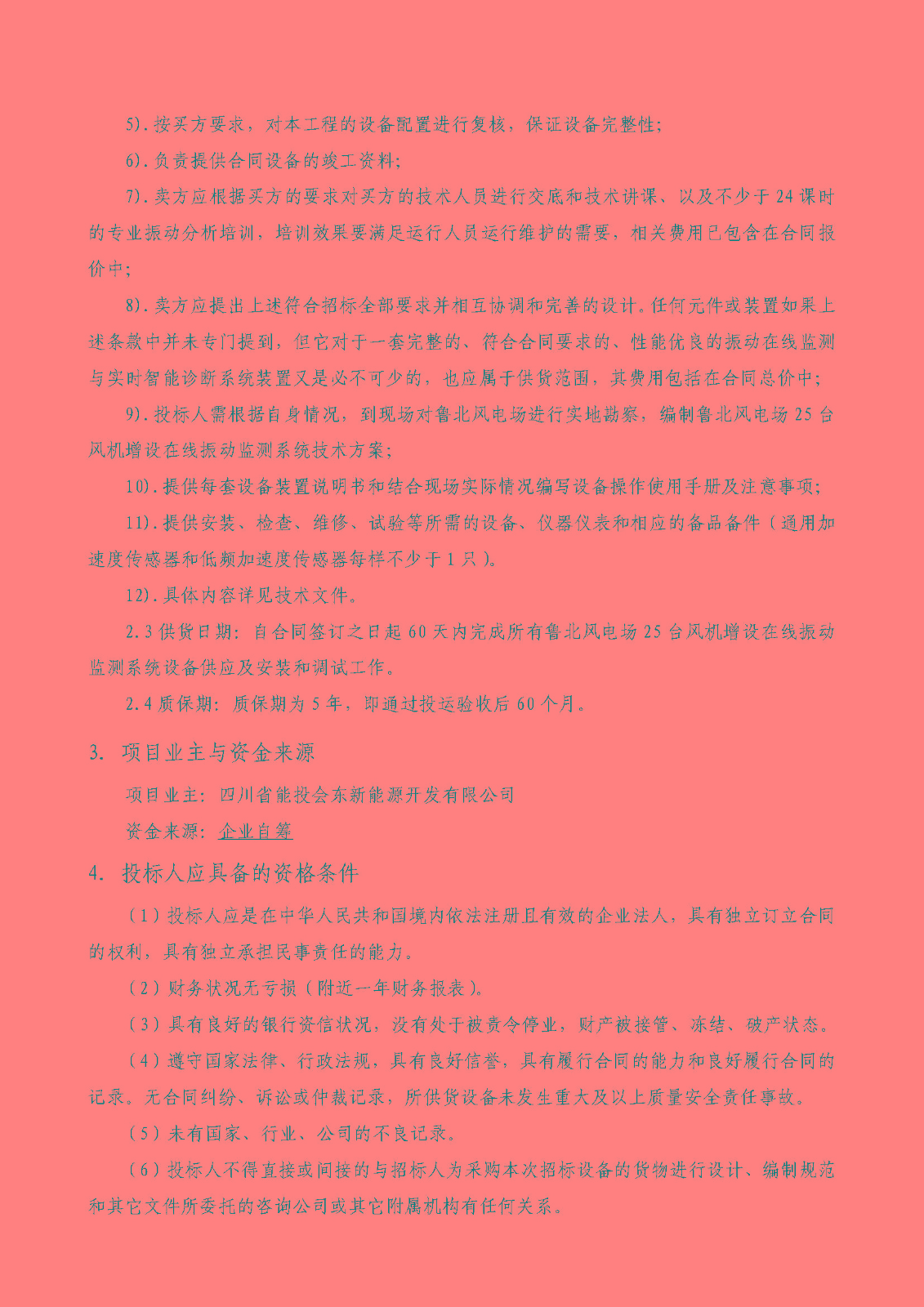9).投标人需根据自身情况,到现场对鲁北风电场进行实地勘察,编制鲁北风电场25台风机增设在线振动监测系统技术方案;