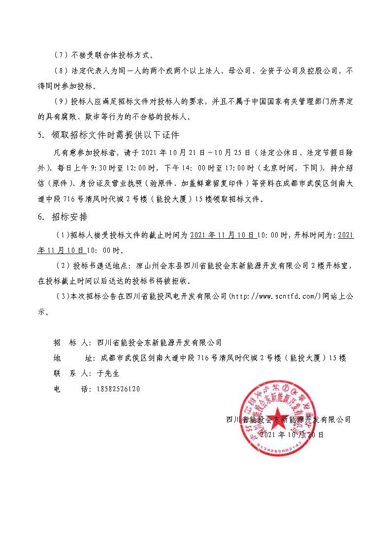 凡有意参加投标者,请于2021年10月21日~10月25日(法定公休日、法定节假日除外),每日上午9:30时至12:00时,下午14:00时至17:00时(北京时间,下同),持介绍信(原件)、身份证及营业执照(验原件、加盖鲜章留复印件)等资料在成都市武侯区剑南大道中段716号清凤时代城2号楼(能投大厦)15楼领取招标文件。