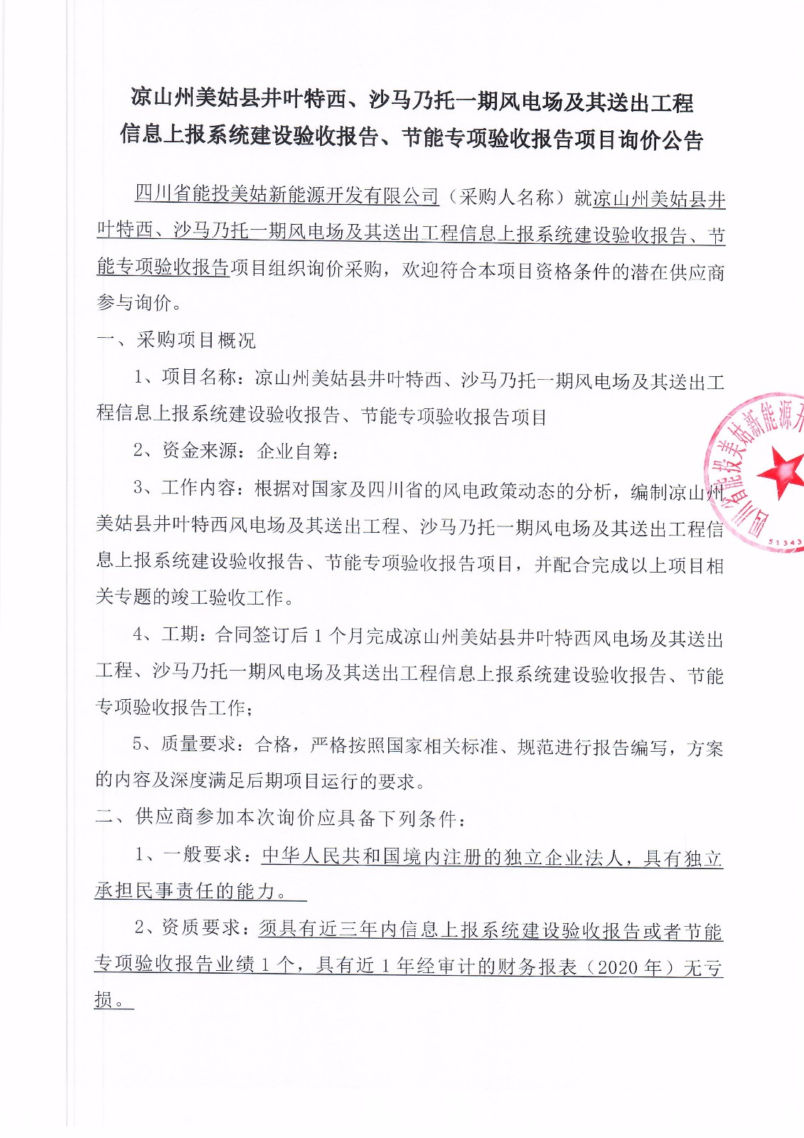 四川省能投美姑新能源开发有限公司(采购人名称)就凉山州美姑县井叶特西、沙马乃托一期风电场及其送出工程信息上报系统建设验收报告、节能专项验收报告项目组织询价采购,欢迎符合本项目资格条件的潜在供应商参与询价。