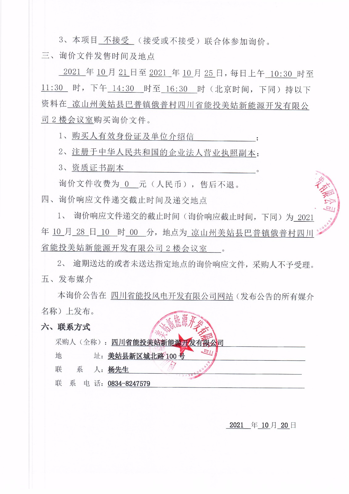 2021 年10月21日至2021 年10月25日,每日上午 10:30 时至11:30 时,下午 14:30 时至 16:30 时(北京时间,下同)持以下资料在 凉山州美姑县巴普镇俄普村四川省能投美姑新能源开发有限公司2楼会议室购买询价文件。