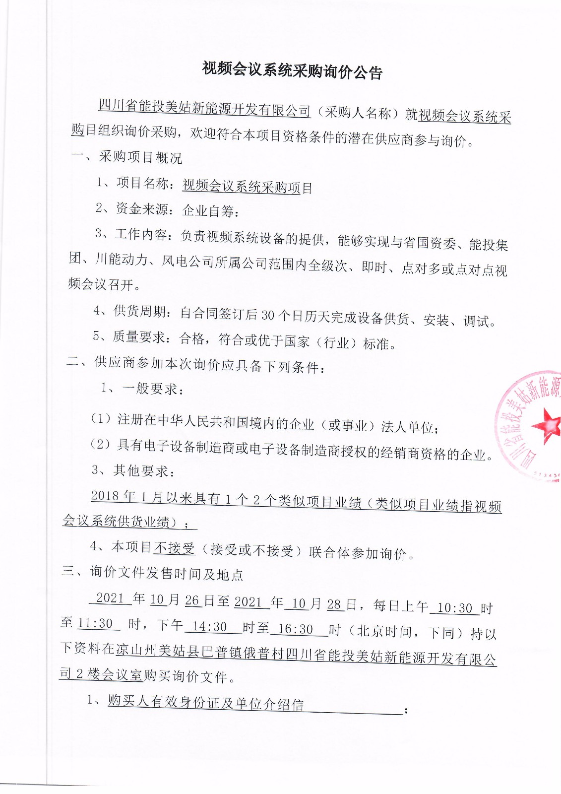 四川省能投美姑新能源开发有限公司(采购人名称)就视频会议系统采购目组织询价采购,欢迎符合本项目资格条件的潜在供应商参与询价。