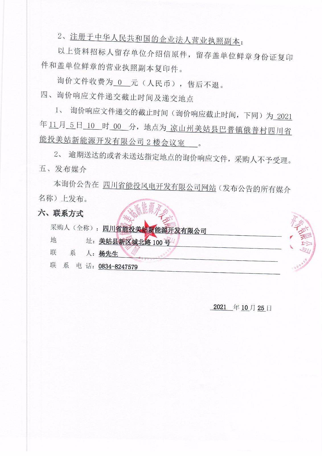 2021 年10月26日至2021 年 10月28日,每日上午 10:30 时至11:30 时,下午 14:30 时至 16:30 时(北京时间,下同)持以下资料在凉山州美姑县巴普镇俄普村四川省能投美姑新能源开发有限公司2楼会议室购买询价文件。
