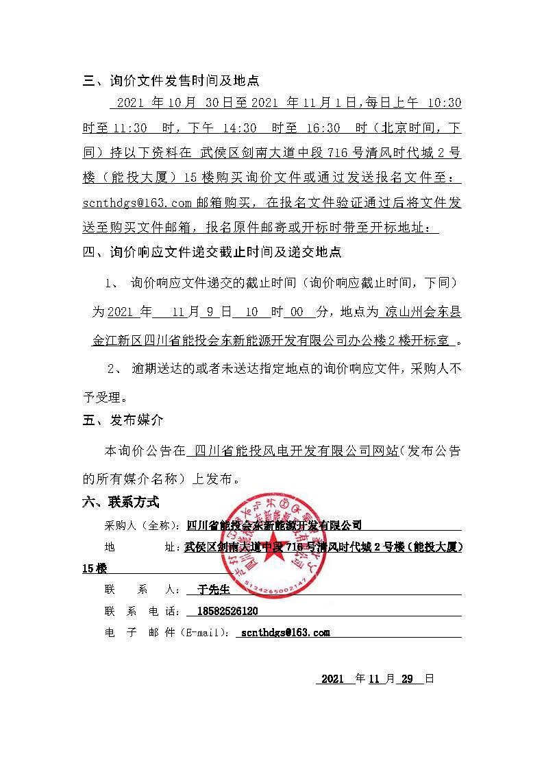 1、 询价响应文件递交的截止时间(询价响应截止时间,下同)为2021 年 11月 9 日 10 时 00 分,地点为 凉山州会东县金江新区四川省能投会东新能源开发有限公司办公楼2楼开标室 。