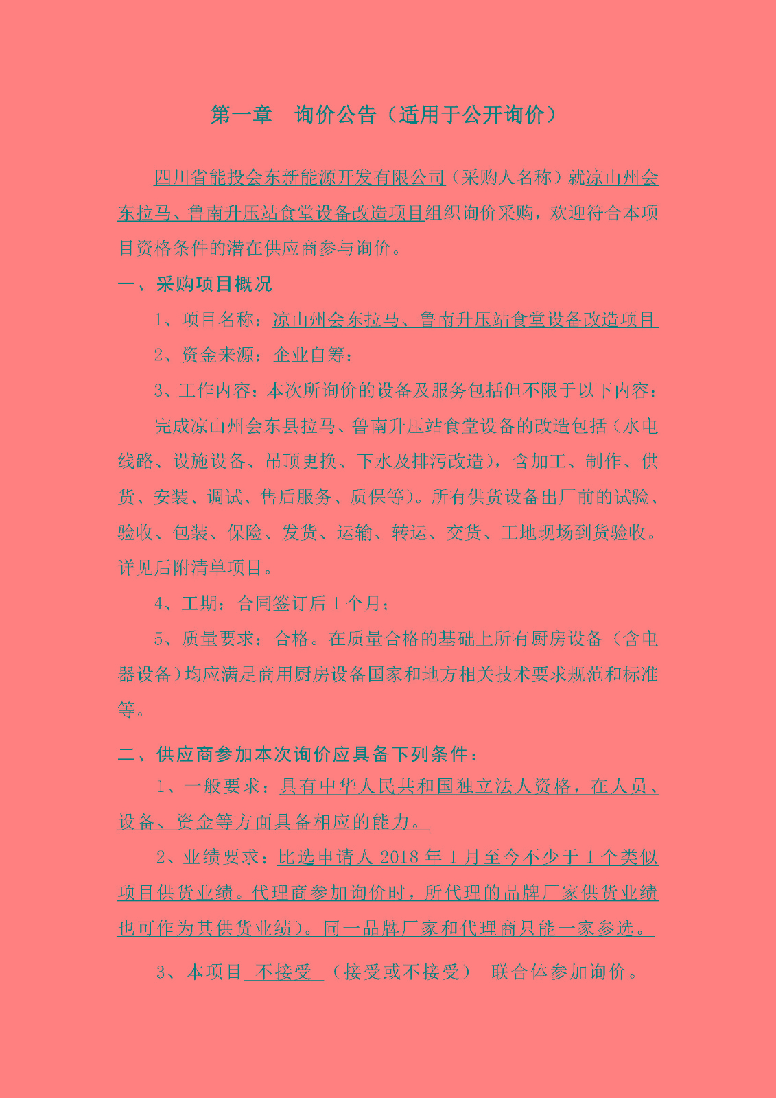 四川省能投会东新能源开发有限公司(采购人名称)就凉山州会东拉马、鲁南升压站食堂设备改造项目组织询价采购,欢迎符合本项目资格条件的潜在供应商参与询价。