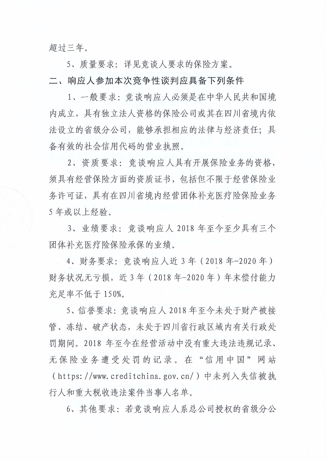 2、资质要求:竞谈响应人具有开展保险业务的资格,须具有经营保险方面的资质证书,包括但不限于经营保险业务许可证,具有在四川省境内经营团体补充医疗险保险业务5年或以上经验。