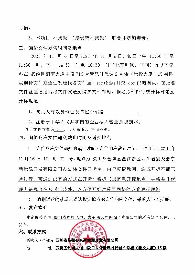 1、 询价响应文件递交的截止时间(询价响应截止时间,下同)为 2021 年 11月16 日 10 时 00 分,地点为 凉山州会东县金江新区四川省能投会东新能源开发有限公司办公楼2楼开标室,由于疫情原因,造成开标不能正常进行,可通过邮寄的方式在开标前将标书邮寄至开标地点,并将委托代理人信息放在密封包装外,以方便开标时采用网络的方式进行联络。