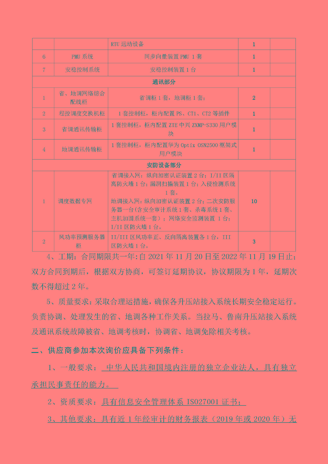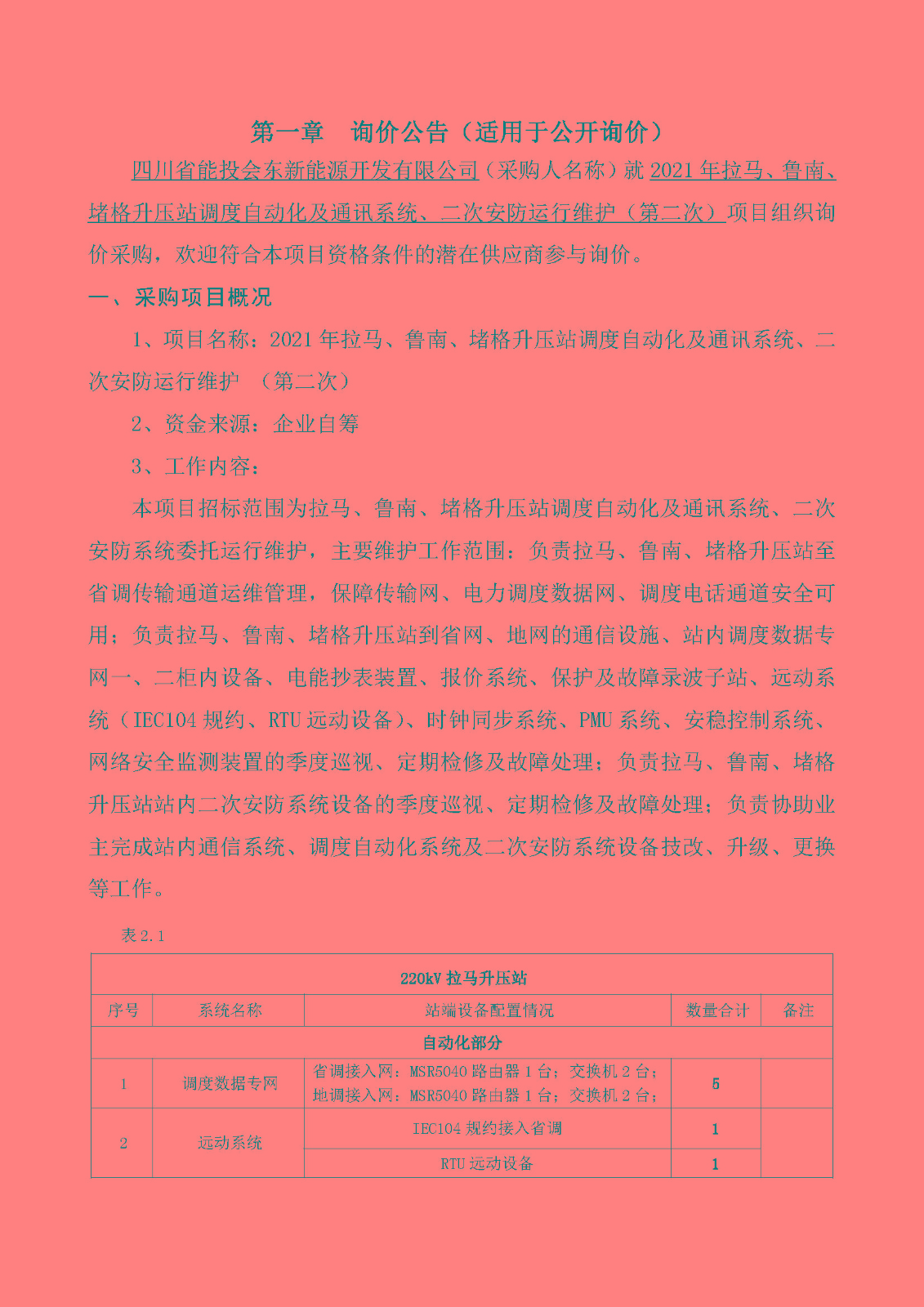 1、项目名称:2021年拉马、鲁南、堵格升压站调度自动化及通讯系统、二次安防运行维护 (第二次)