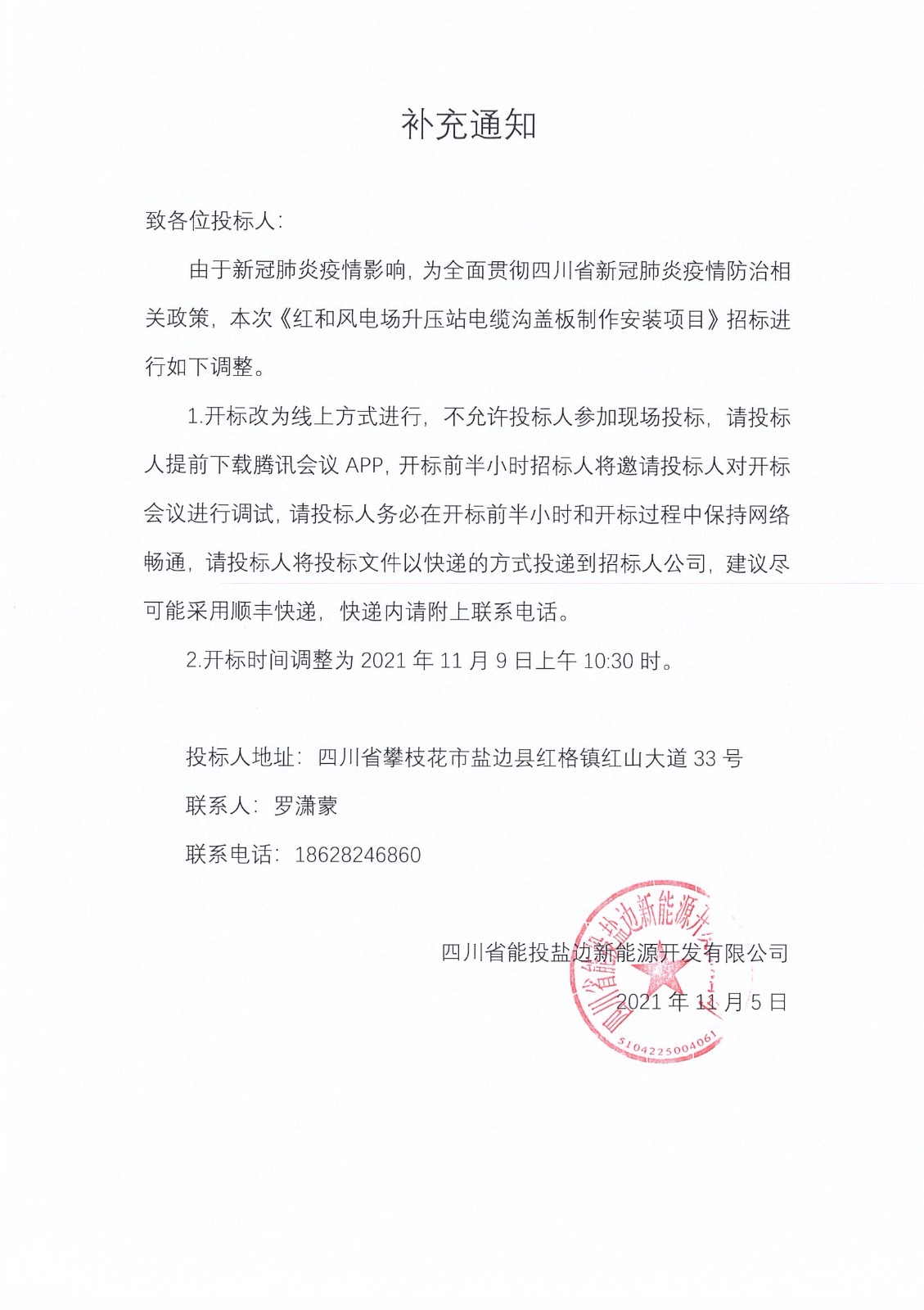 由于新冠肺炎疫情影响,为全面贯彻四川省新冠肺炎疫情防治相关政策,本次《红和风电场升压站电缆沟盖板制作安装项目》招标进行如下调整。
