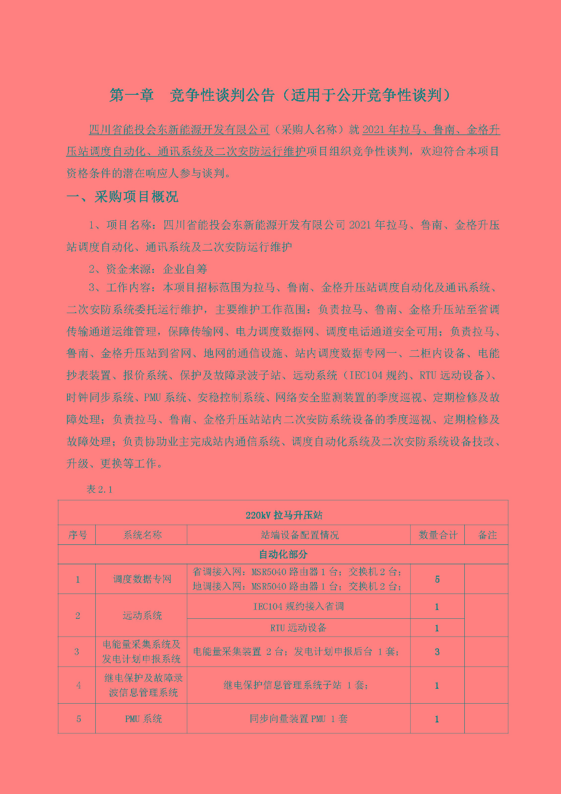 1、项目名称:四川省能投会东新能源开发有限公司2021年拉马、鲁南、金格升压站调度自动化、通讯系统及二次安防运行维护