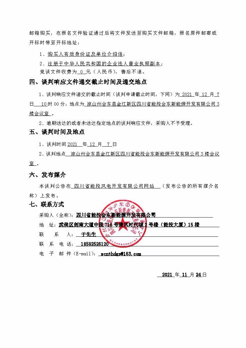 1、谈判响应文件递交的截止时间(谈判申请截止时间,下同)为 2021 年 12 月 7 日 10时00分,地点为 凉山州会东县金江新区四川省能投会东新能源开发有限公司3楼会议室 。