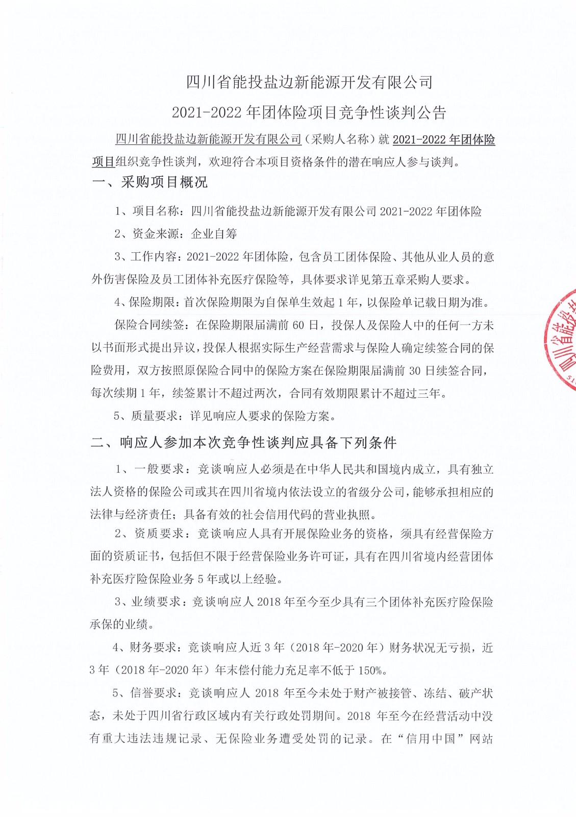四川省能投盐边新能源开发有限公司(采购人名称)就2021-2022年团体险项目组织竞争性谈判,欢迎符合本项目资格条件的潜在响应人参与谈判。