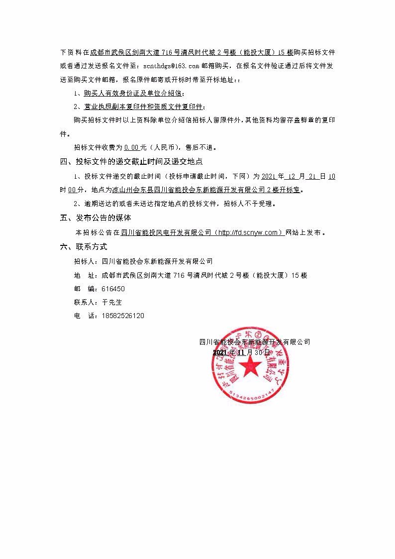 1、投标文件递交的截止时间(投标申请截止时间,下同)为2021年 12 月 21 日10时00分,地点为凉山州会东县四川省能投会东新能源开发有限公司2楼开标室。