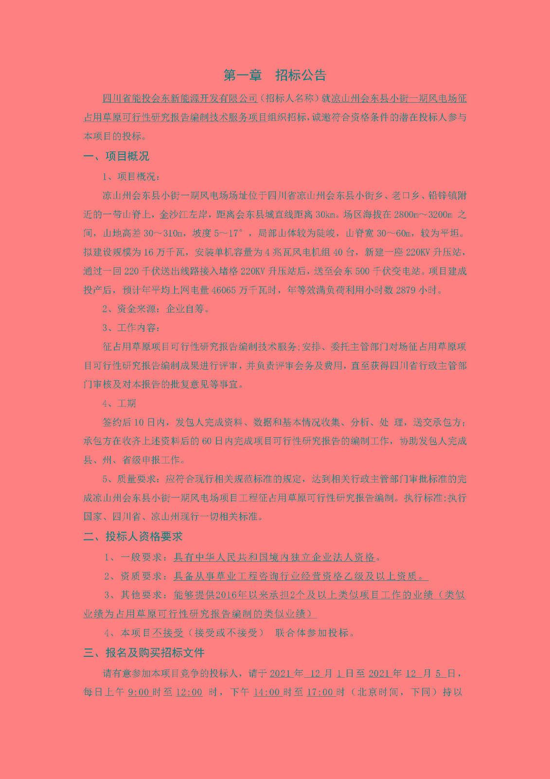 四川省能投会东新能源开发有限公司(招标人名称)就凉山州会东县小街一期风电场征占用草原可行性研究报告编制技术服务项目组织招标,诚邀符合资格条件的潜在投标人参与本项目的投标。