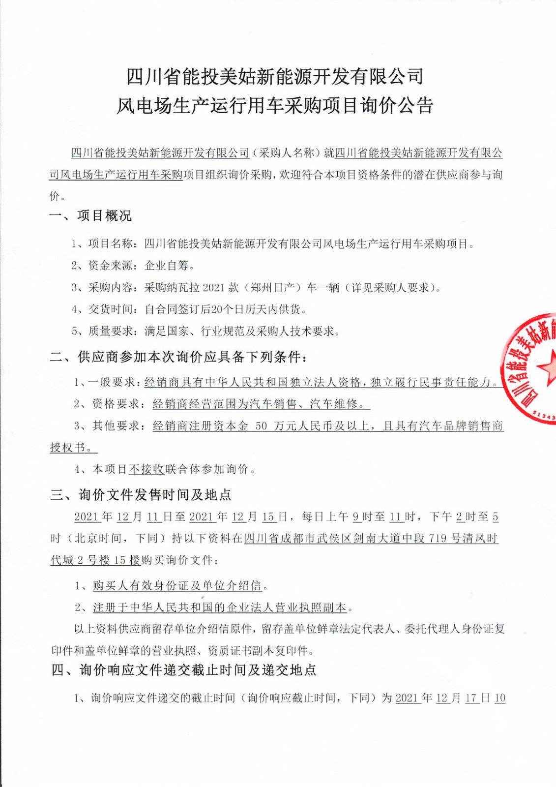 四川省能投美姑新能源开发有限公司(采购人名称)就四川省能投美姑新能源开发有限公司风电场生产运行用车采购项目组织询价采购,欢迎符合本项目资格条件的潜在供应商参与询价。