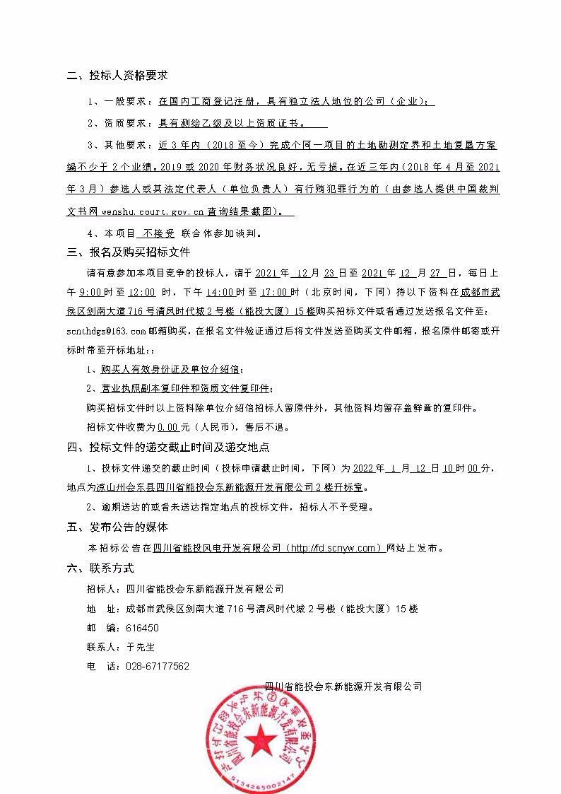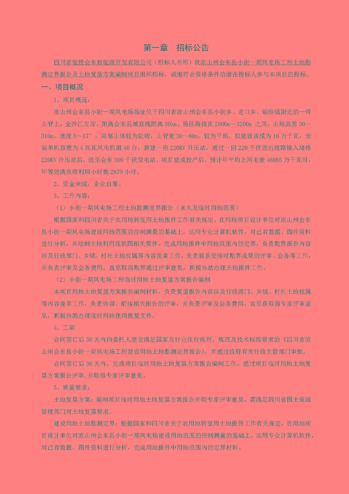 四川省能投会东新能源开发有限公司(招标人名称)就凉山州会东县小街一期风电场工程土地勘测定界报告及土地复垦方案编制项目组织招标,诚邀符合资格条件的潜在投标人参与本项目的投标。
