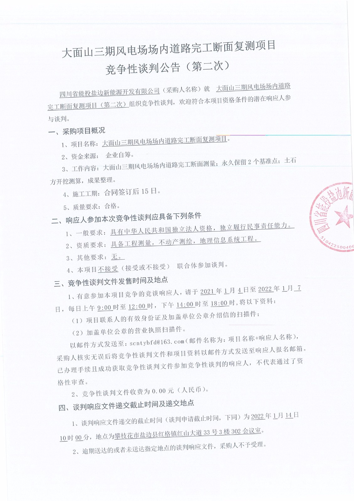 四川省能投盐边新能源开发有限公司(采购人名称)就 大面山三期风电场场内道路完工断面复测项目(第二次)组织竞争性谈判,欢迎符合本项目资格条件的潜在响应人参与谈判。