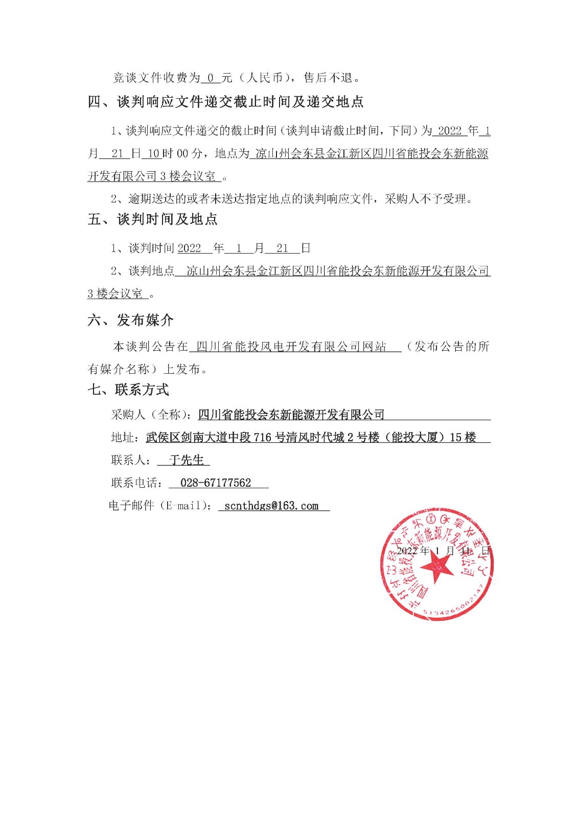 1、谈判响应文件递交的截止时间(谈判申请截止时间,下同)为 2022 年 1 月 21 日 10时00分,地点为 凉山州会东县金江新区四川省能投会东新能源开发有限公司3楼会议室 。