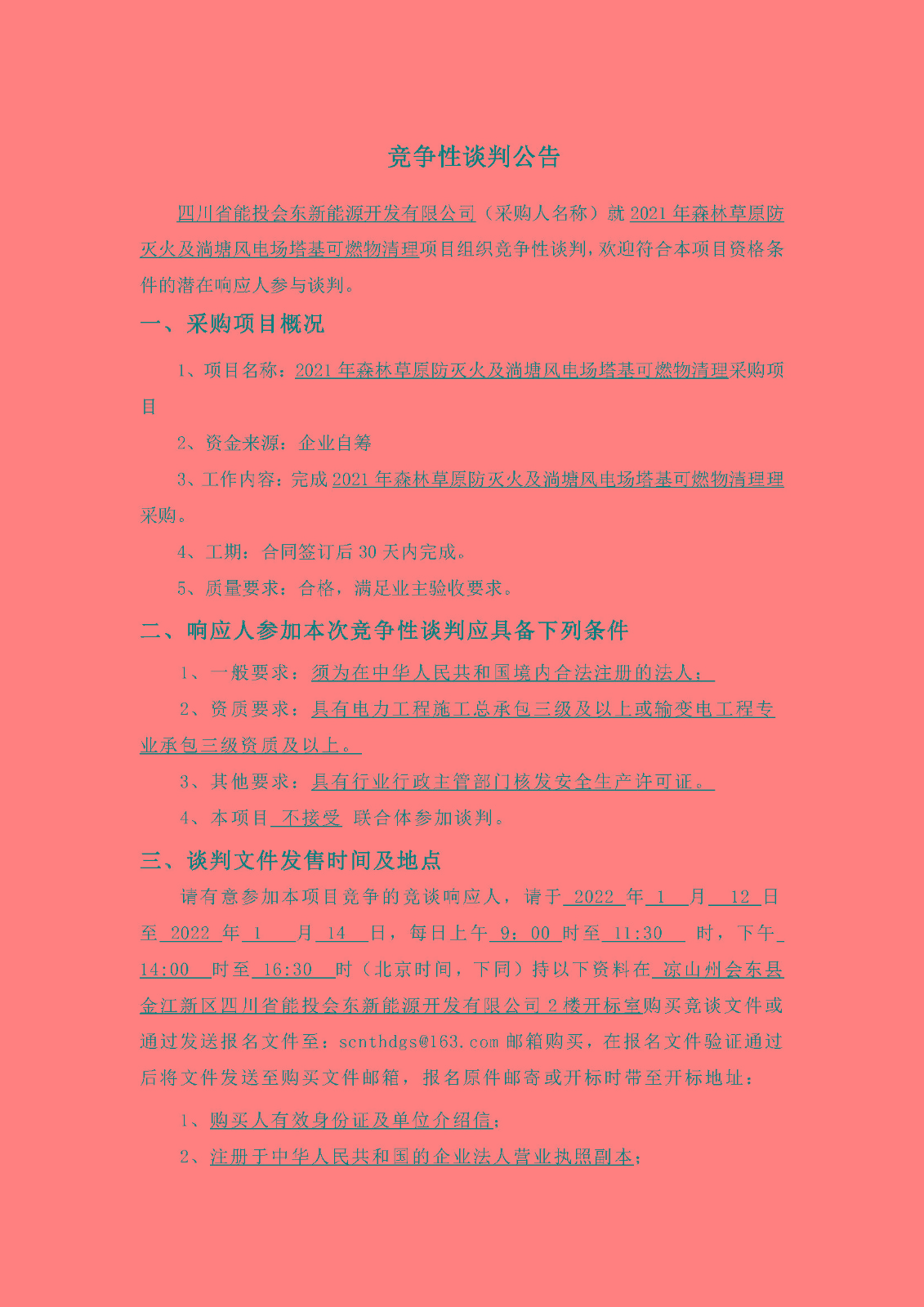 四川省能投会东新能源开发有限公司(采购人名称)就2021年森林草原防灭火及淌塘风电场塔基可燃物清理项目组织竞争性谈判,欢迎符合本项目资格条件的潜在响应人参与谈判。