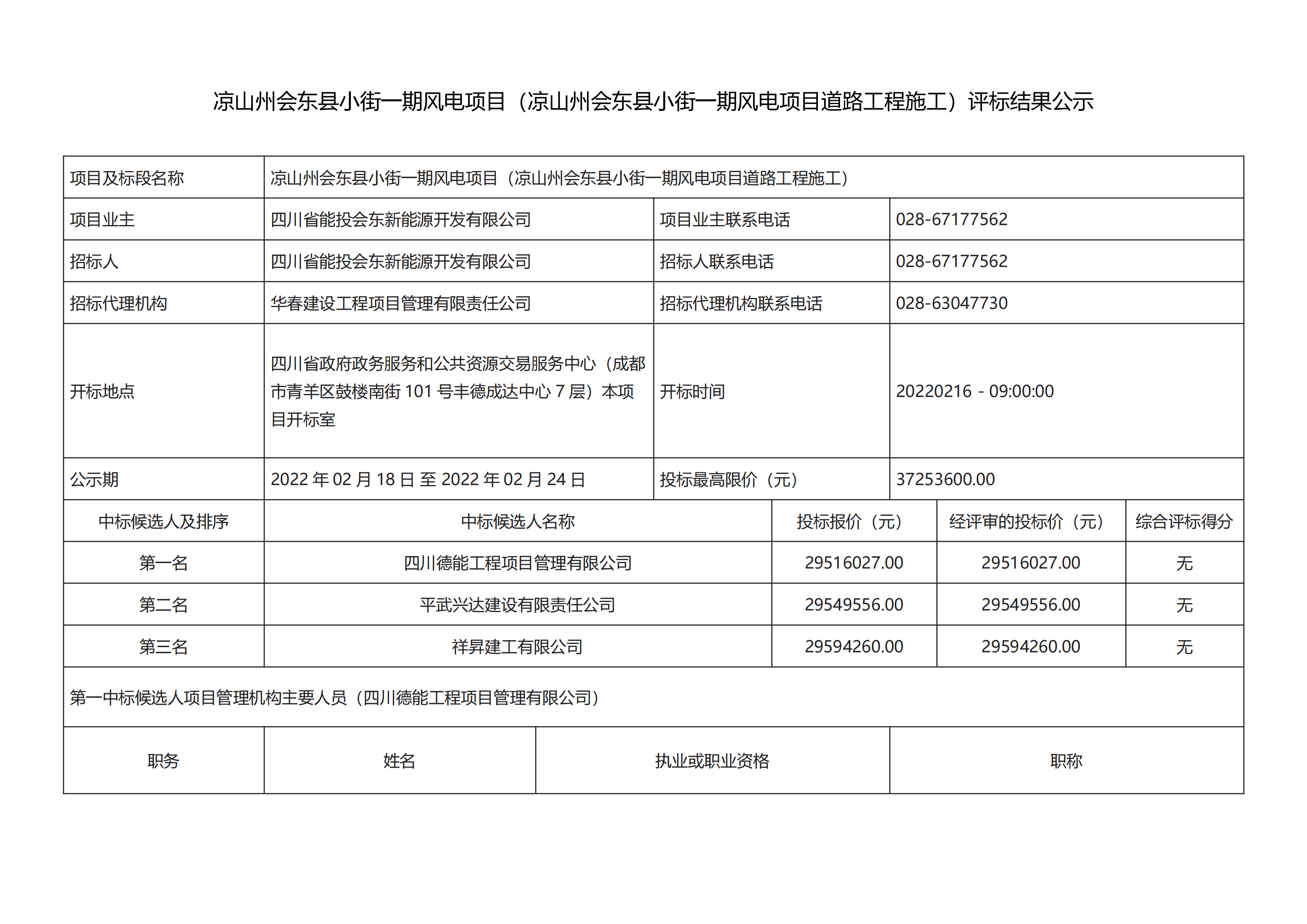 凉山州会东县小街一期风电项目(凉山州会东县小街一期风电项目道路工程施工)评标结果公示