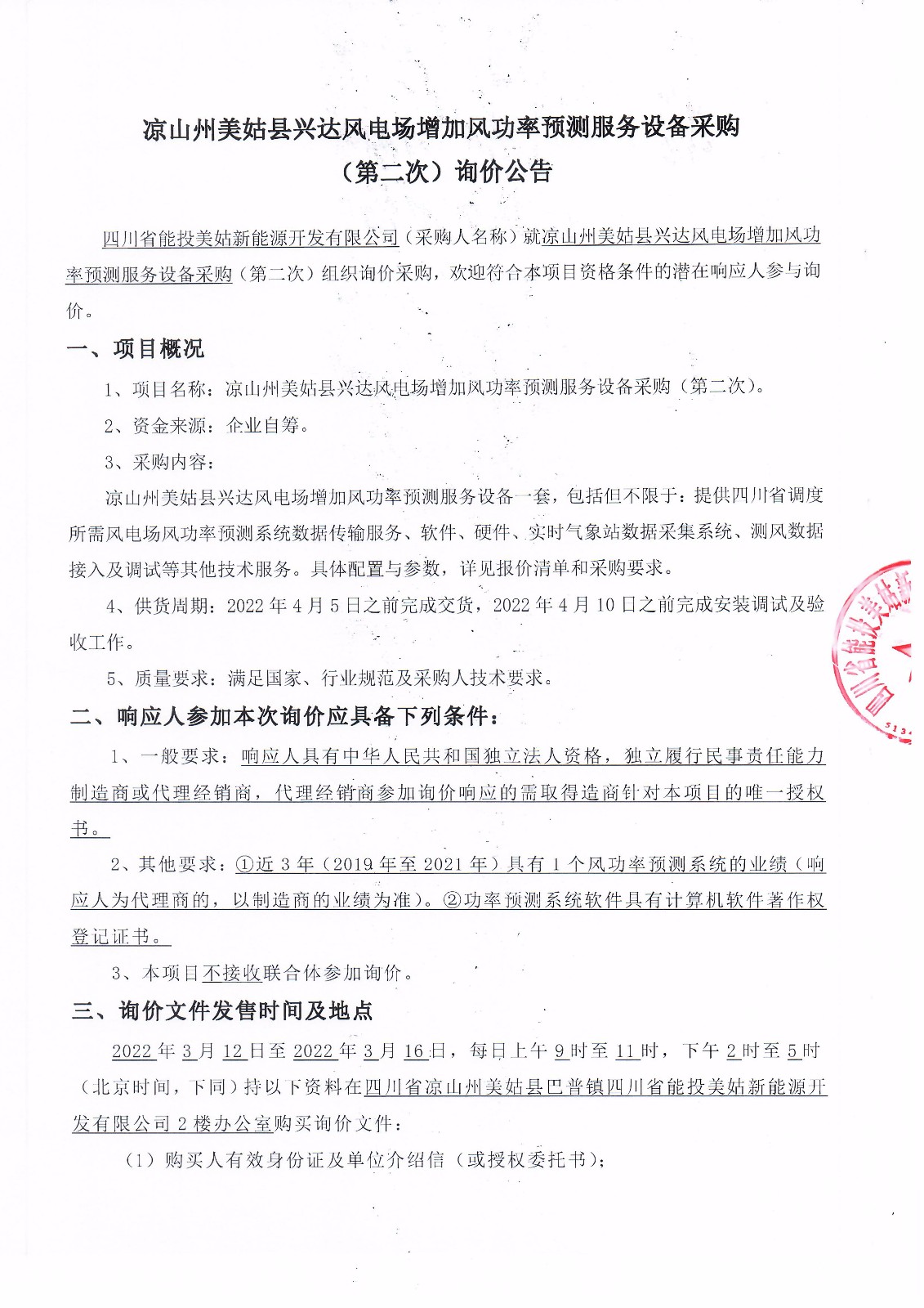 四川省能投美姑新能源开发有限公司(采购人名称)就凉山州美姑县兴达风电场增加风功率预测服务设备采购(第二次)组织询价采购,欢迎符合本项目资格条件的潜在响应人参与询价。