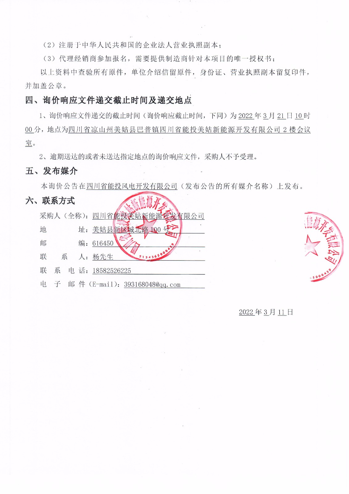 1、询价响应文件递交的截止时间(询价响应截止时间,下同)为2022年3月21日10时00分,地点为四川省凉山州美姑县巴普镇四川省能投美姑新能源开发有限公司2楼会议室。