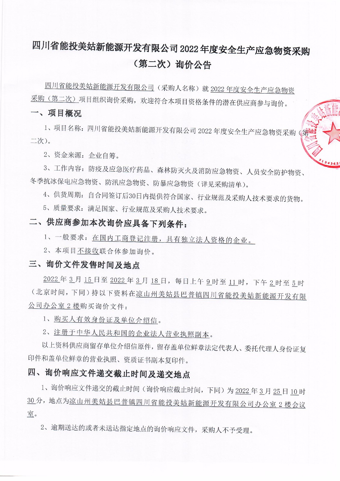 1、询价响应文件递交的截止时间(询价响应截止时间,下同)为2022年3月25日10时30分,地点为凉山州美姑县巴普镇四川省能投美姑新能源开发有限公司办公室2楼会议室。
