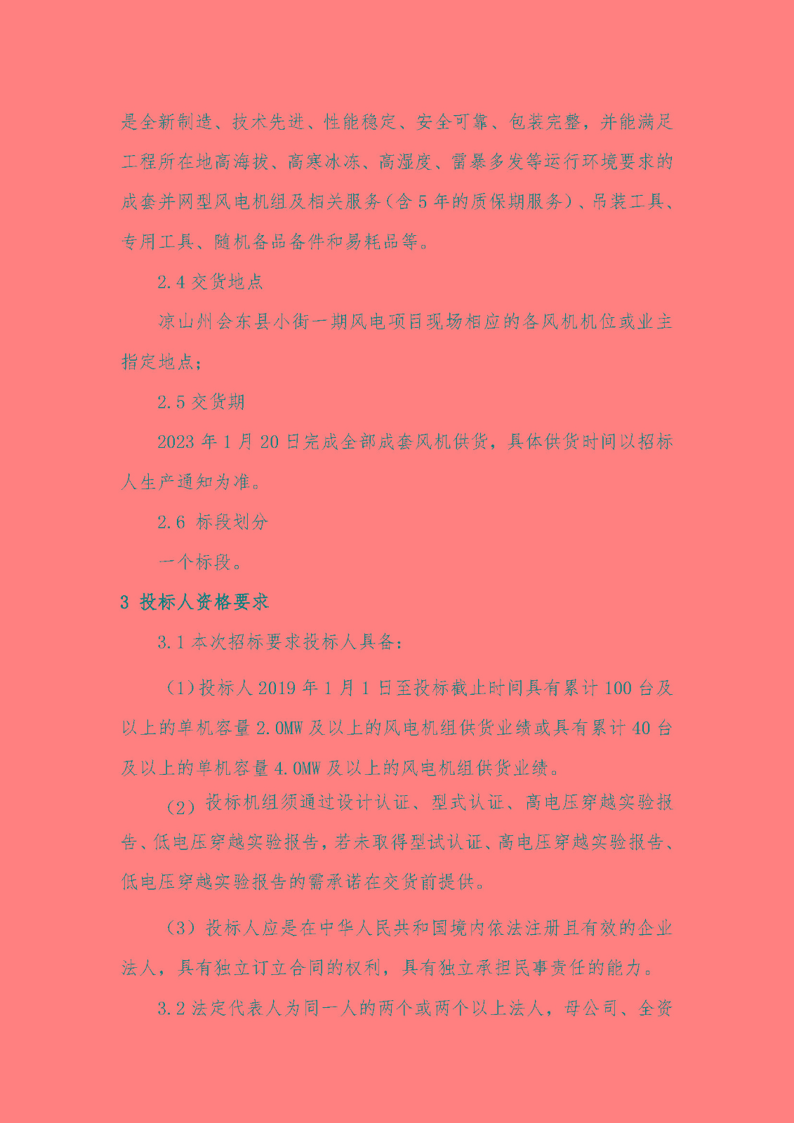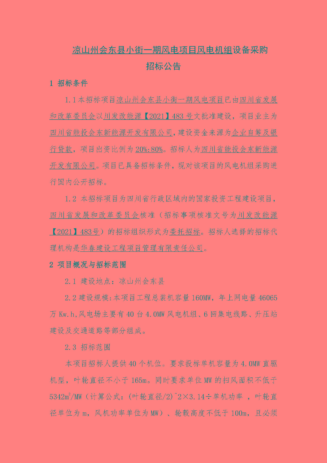 1.1本招标项目凉山州会东县小街一期风电项目已由四川省发展和改革委员会以川发改能源【2021】483号文批准建设,项目业主为四川省能投会东新能源开发有限公司,建设资金来源为企业自筹及银行贷款,项目出资比例为20%:80%。招标人为四川省能投会东新能源开发有限公司。项目已具备招标条件,现对该项目的风电机组采购进行国内公开招标。