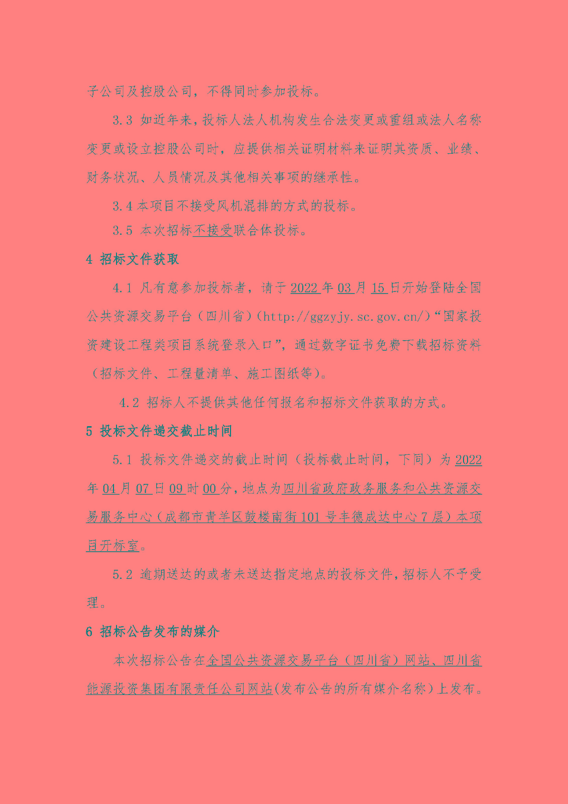 4.1 凡有意参加投标者,请于2022年03月15日开始登陆全国公共资源交易平台(四川省)(http://ggzyjy.sc.gov.cn/)“国家投资建设工程类项目系统登录入口”,通过数字证书免费下载招标资料(招标文件、工程量清单、施工图纸等)。