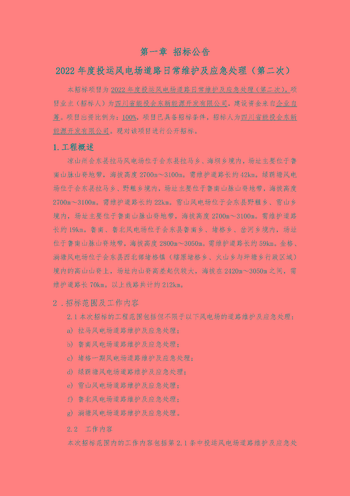 本招标项目为2022年度投运风电场道路日常维护及应急处理(第二次),项目业主(招标人)为四川省能投会东新能源开发有限公司,建设资金来自企业自筹。项目出资比例为:100%,项目已具备招标条件,招标人为四川省能投会东新能源开发有限公司。现对该项目进行公开招标。