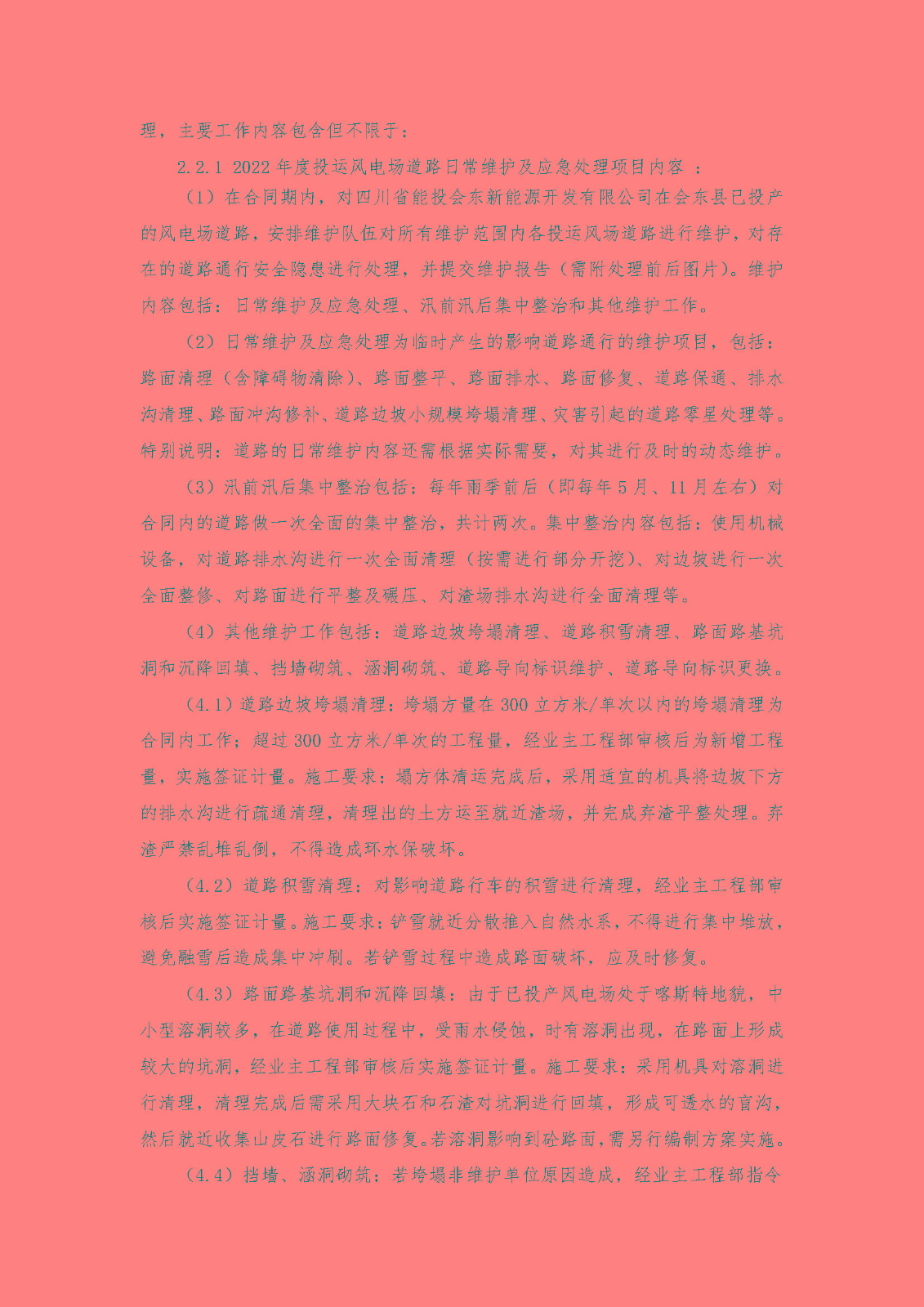 (1)在合同期内,对四川省能投会东新能源开发有限公司在会东县已投产的风电场道路,安排维护队伍对所有维护范围内各投运风场道路进行维护,对存在的道路通行安全隐患进行处理,并提交维护报告(需附处理前后图片)。维护内容包括:日常维护及应急处理、汛前汛后集中整治和其他维护工作。