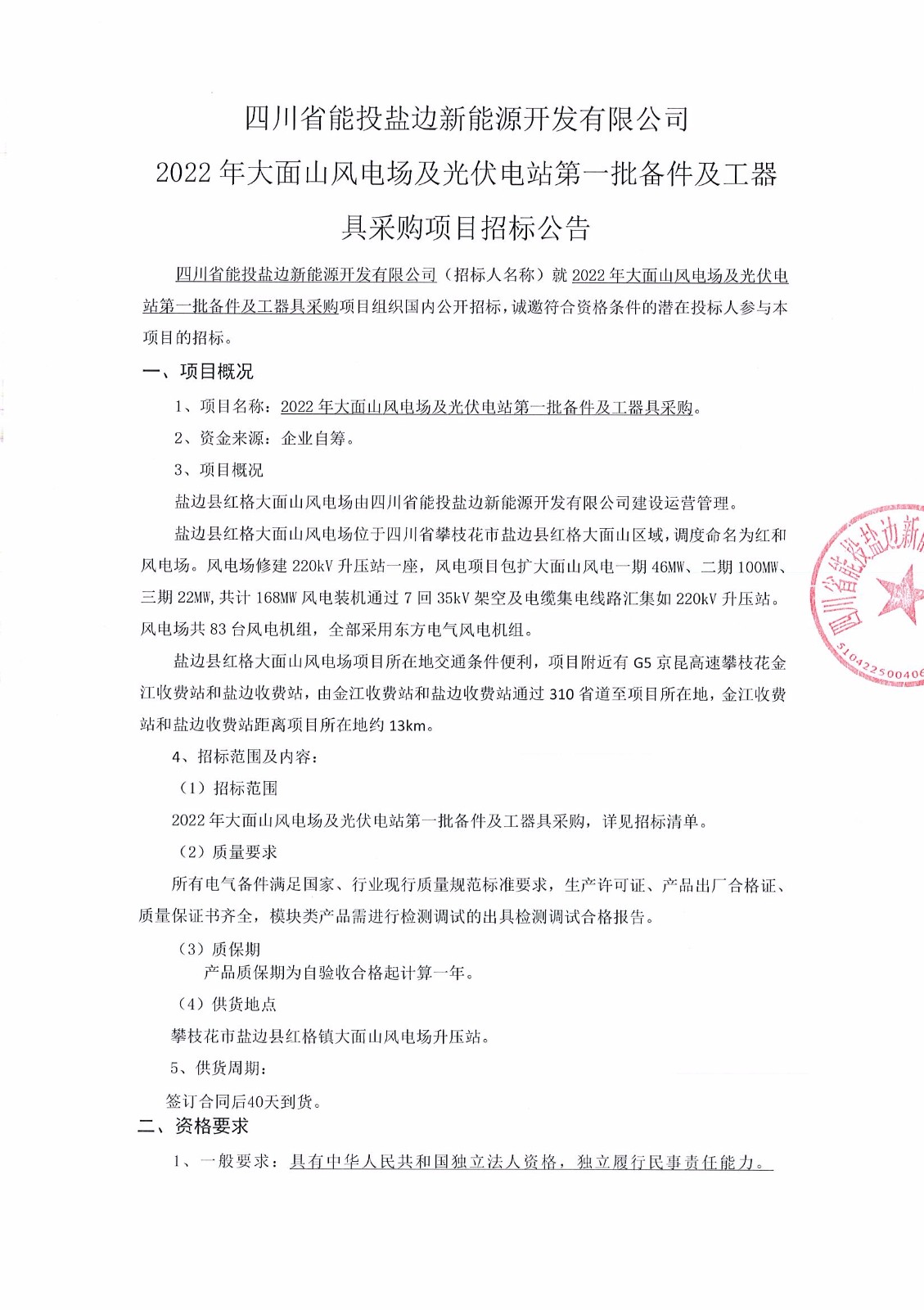四川省能投盐边新能源开发有限公司(招标人名称)就2022年大面山风电场及光伏电站第一批备件及工器具采购项目组织国内公开招标,诚邀符合资格条件的潜在投标人参与本项目的招标。