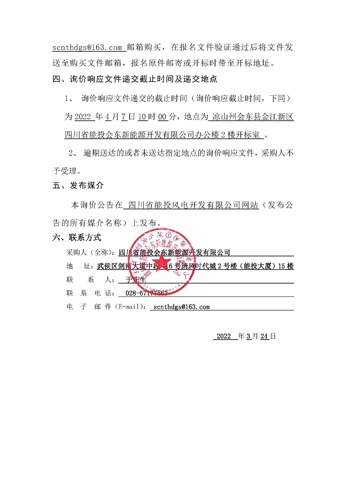 1、 询价响应文件递交的截止时间(询价响应截止时间,下同)为2022 年4月7日10时00分,地点为 凉山州会东县金江新区四川省能投会东新能源开发有限公司办公楼2楼开标室 。
